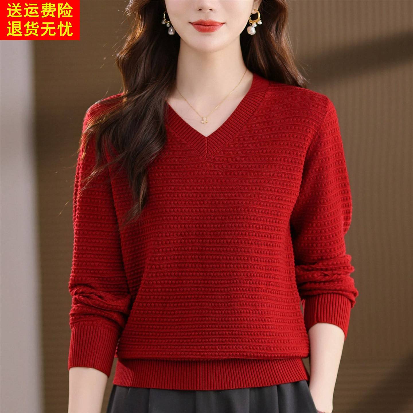 妈妈高端桑蚕丝长袖t恤女大码春秋季时尚V领针织上衣洋气打底小衫