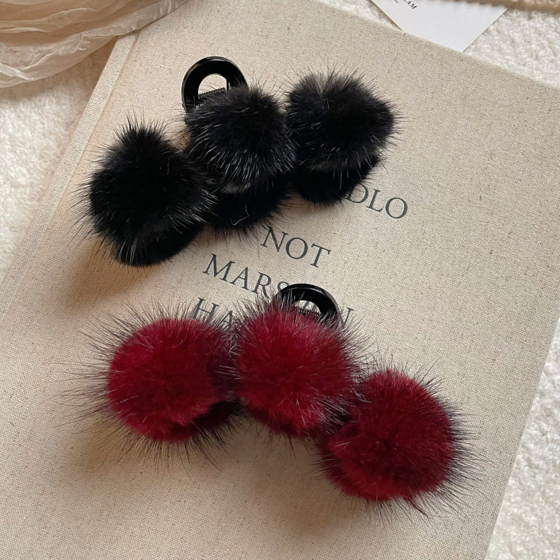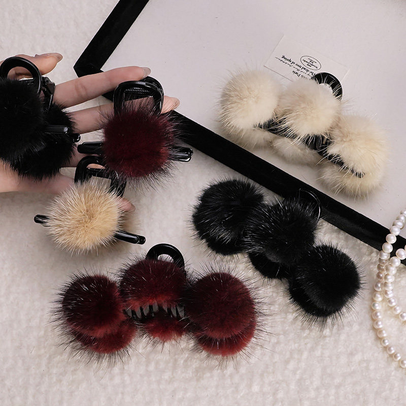 秋冬新款水貂毛球大号抓夹小众复古法式毛茸茸盘发鲨鱼夹毛绒头饰