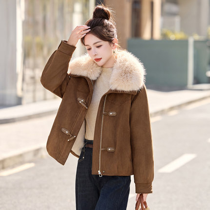 大毛领麂皮绒短外套女2025冬季百搭显瘦加绒加厚保暖皮毛一体棉衣