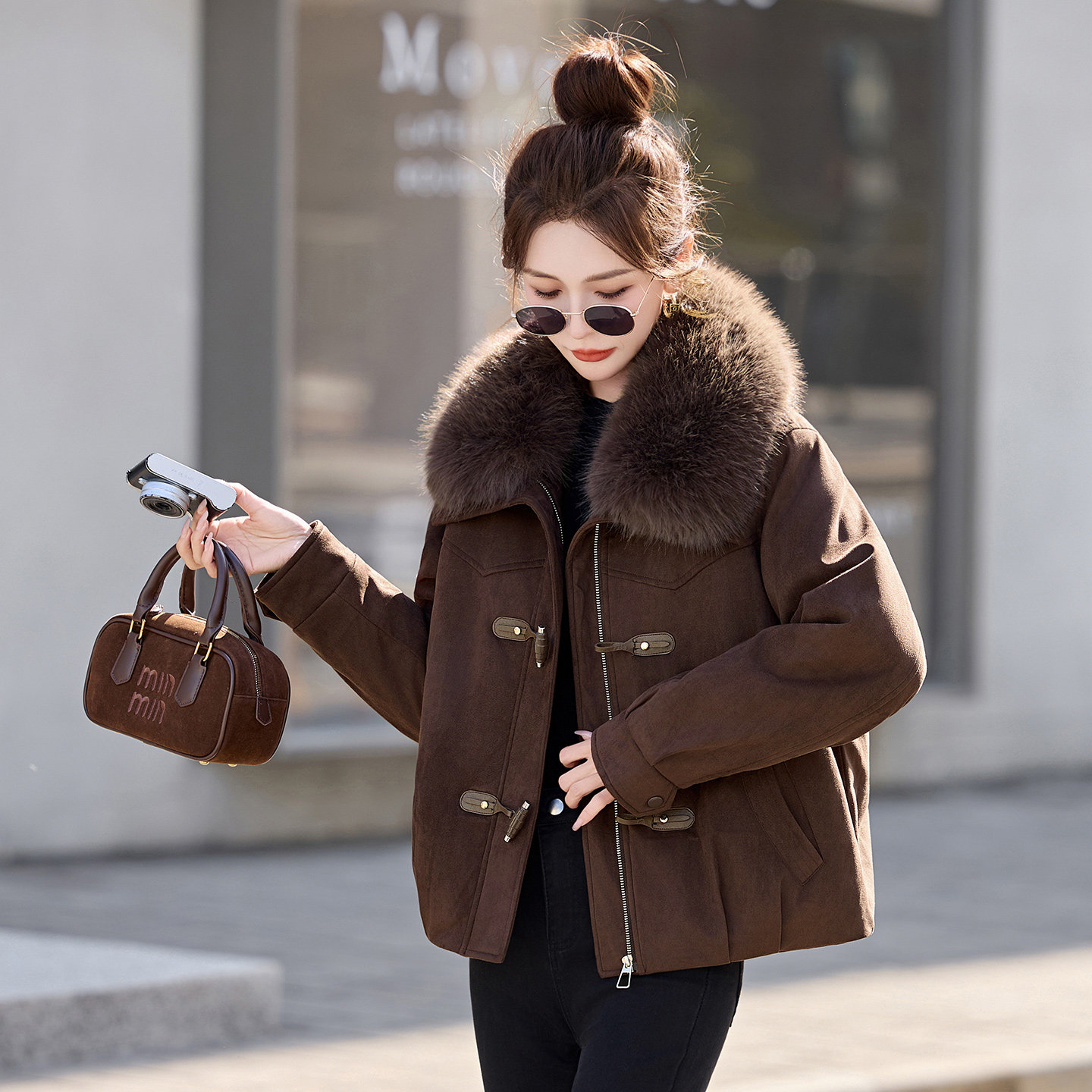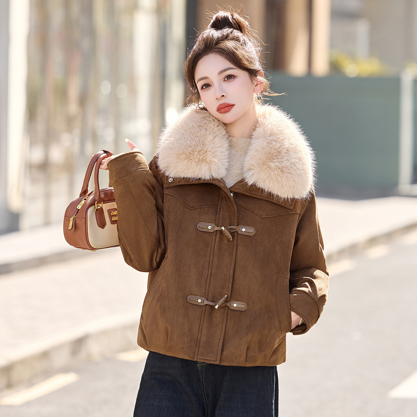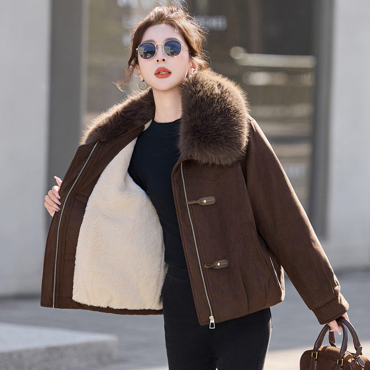 大毛领麂皮绒短外套女
