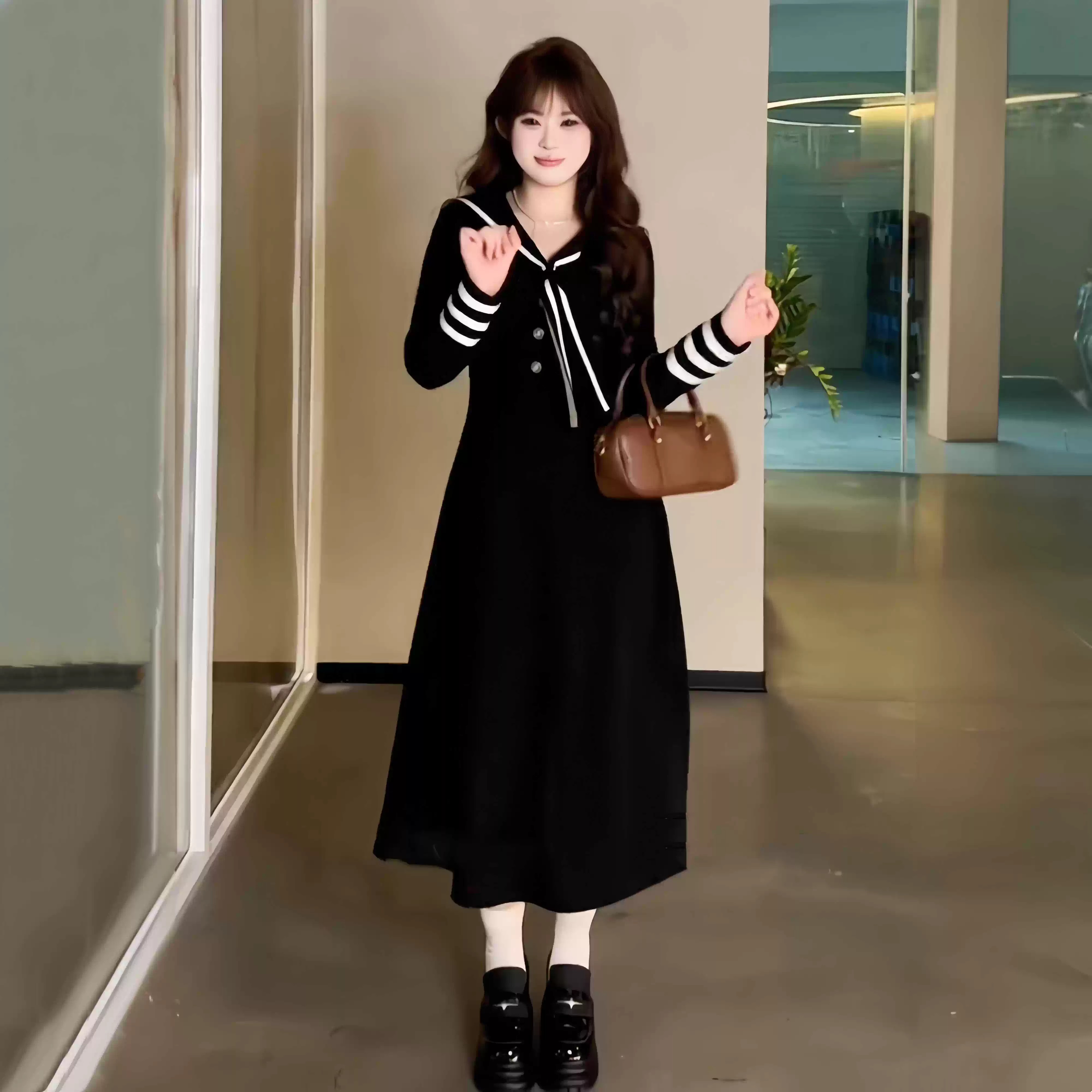 大码海军领气质黑色连衣裙女秋季300斤胖mm梨型身材收腰显瘦长裙