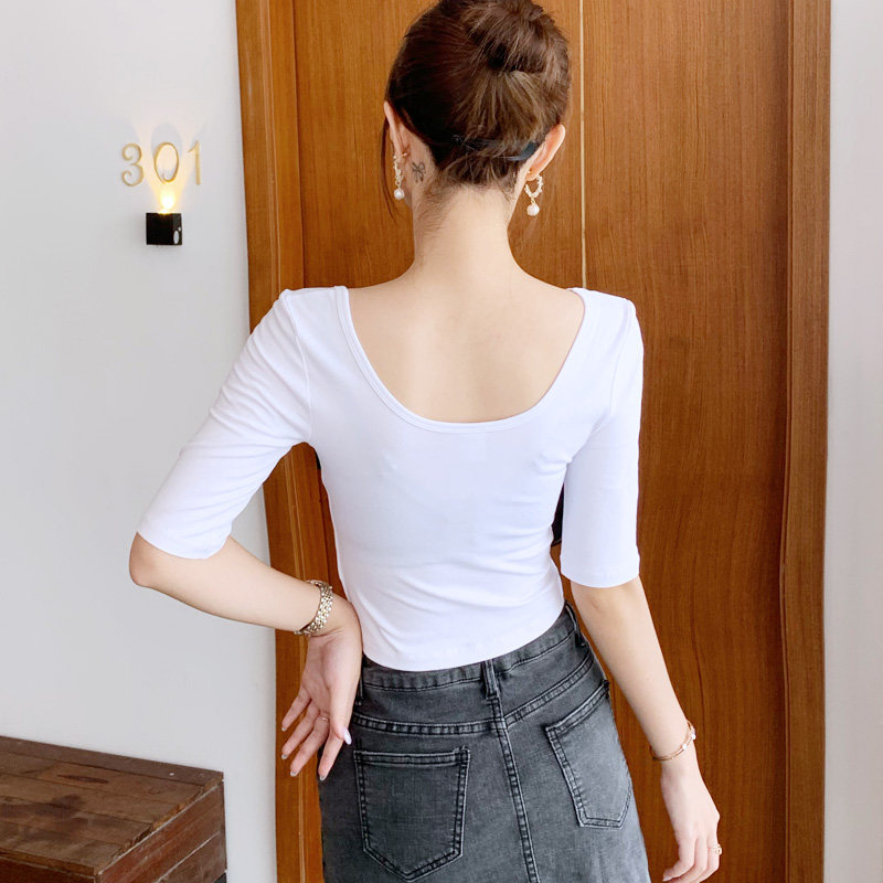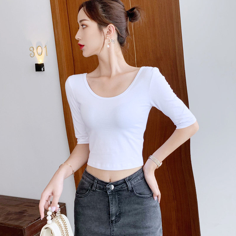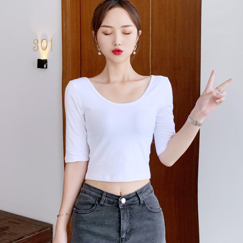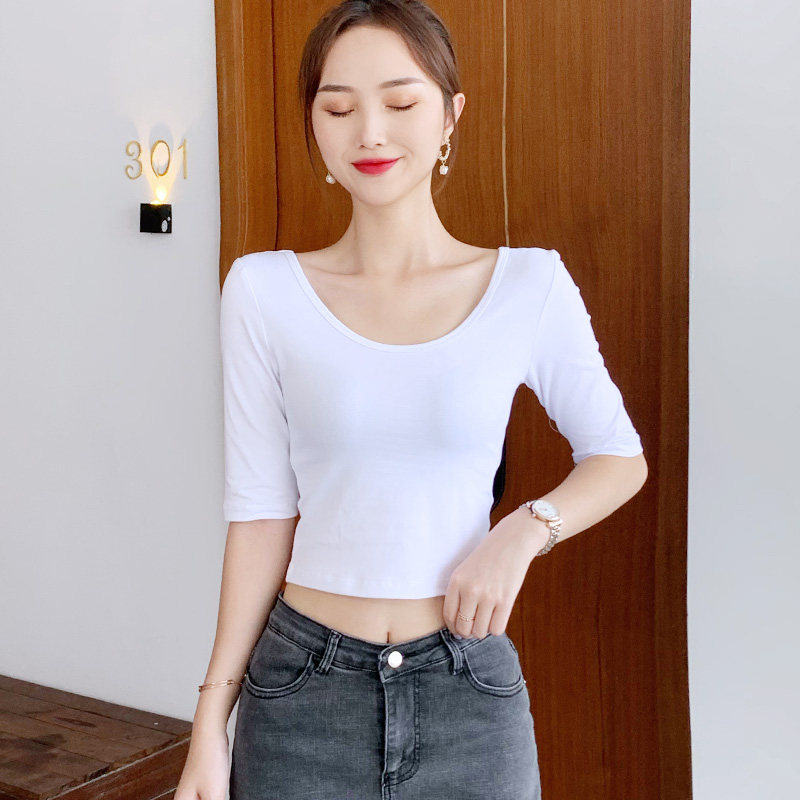 前后U领中袖T恤女五分袖纯棉紧身内搭打底衫露肚脐低领口露背上衣