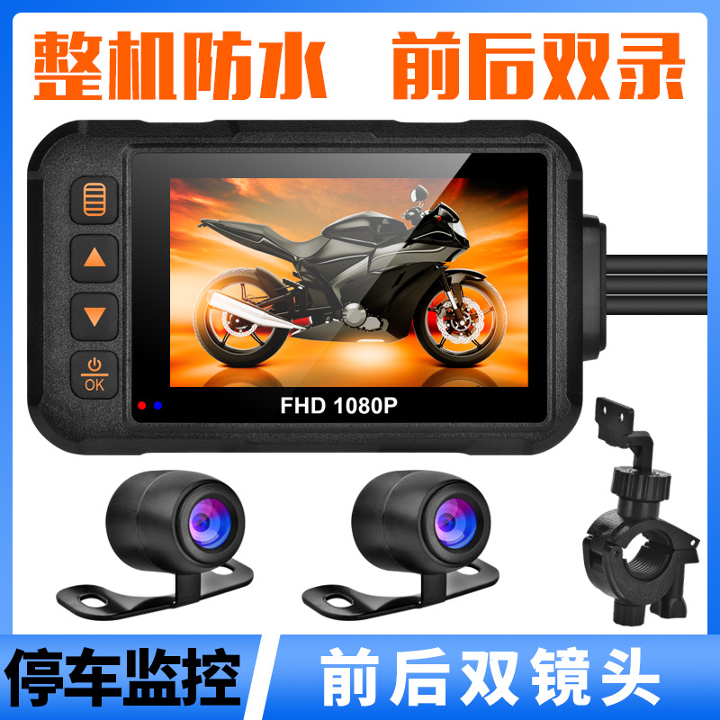 新款3.0寸屏整机防水尘前后高清摩托车行车记录仪前后双镜头广角