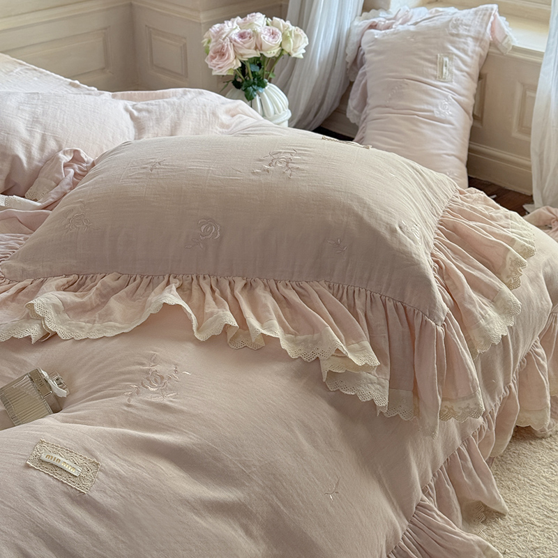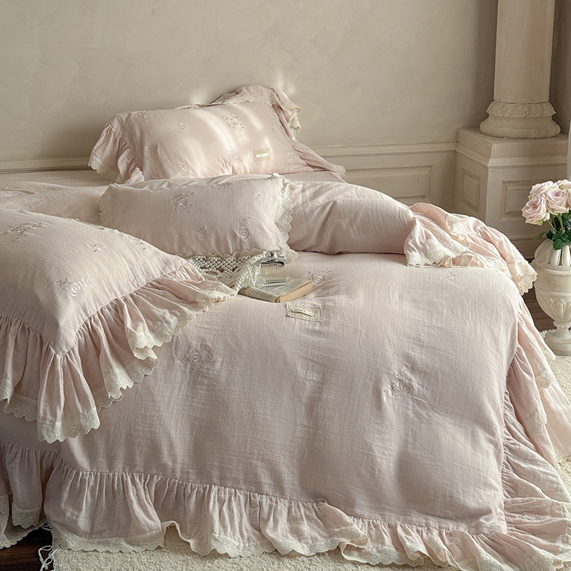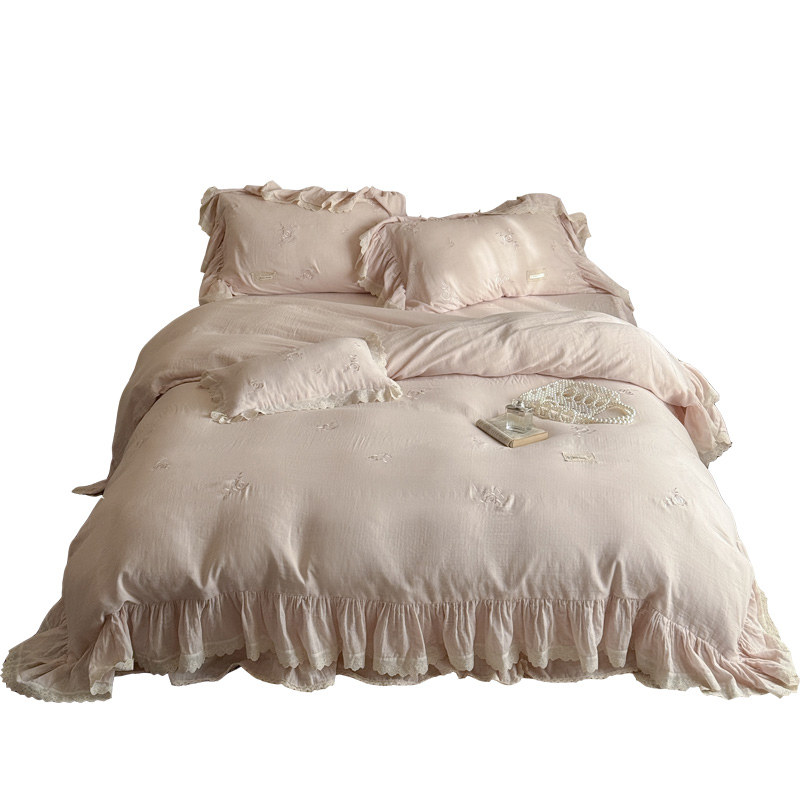 法式公主风全棉双层皱皱纱刺绣四件套柔软吸湿纯棉荷叶边被套床品