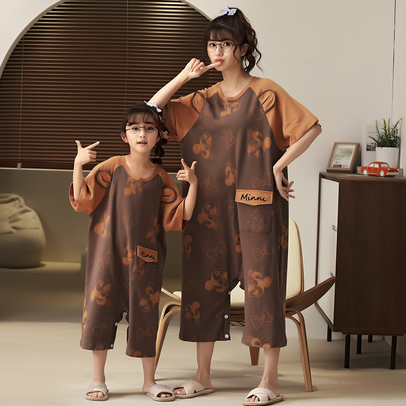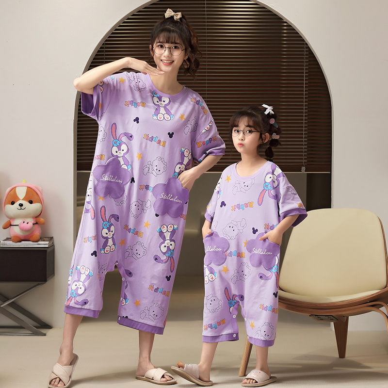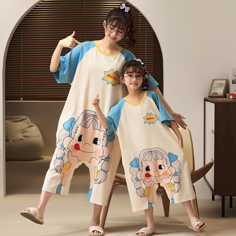 母女连体睡裙儿童夏季宝可梦短袖纯棉女童连体睡衣女孩防踢家居服