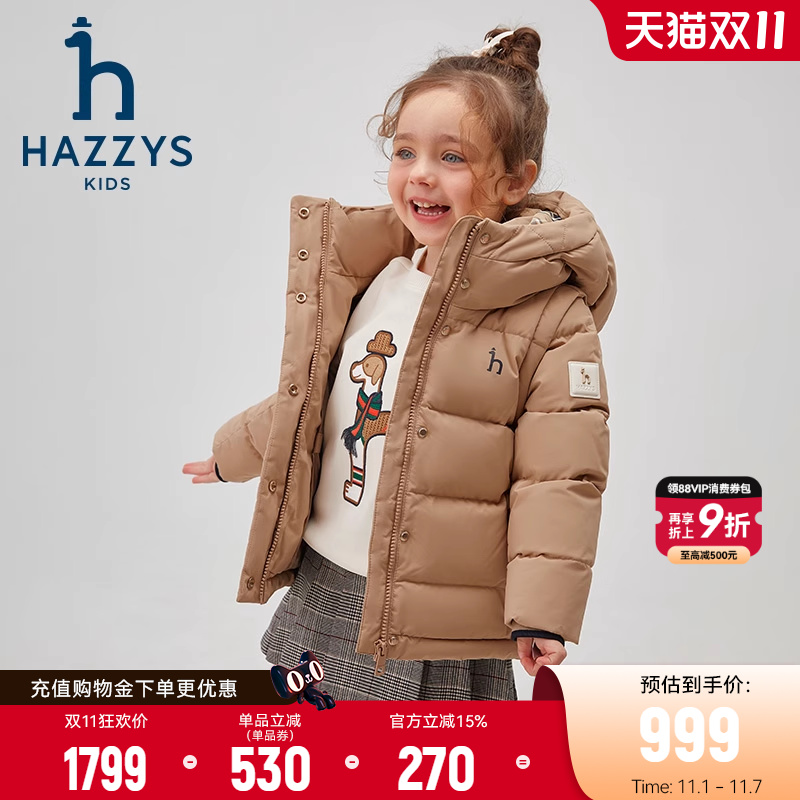 hazzys哈吉斯童装男女宝宝羽绒服冬新高充绒袖子可拆卸三防外套