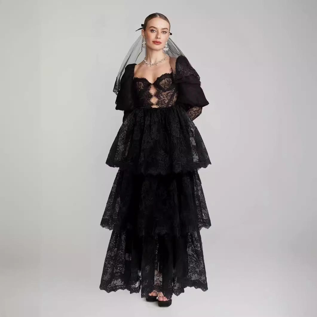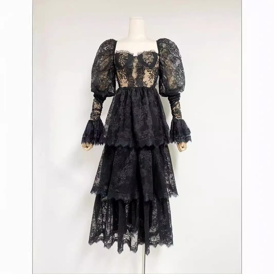 2024夏季法式设计长袖抹胸蕾丝拼接网纱长款连衣裙女高腰4116-2
