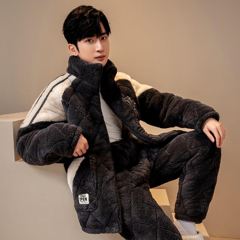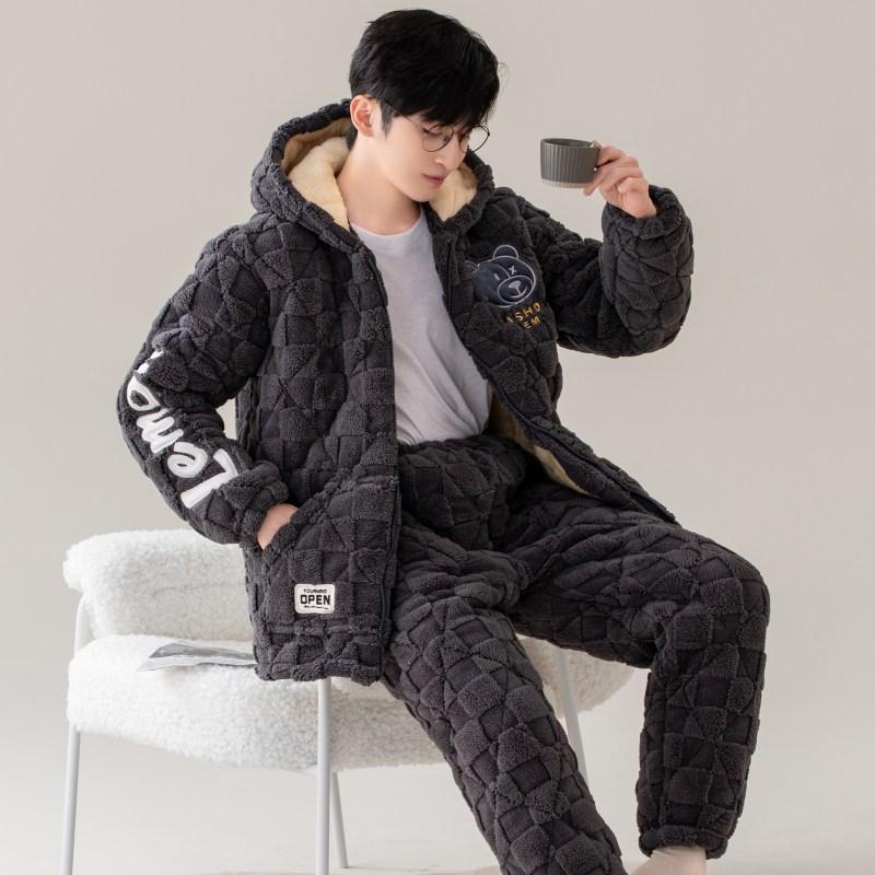 男士睡衣冬季加绒加厚珊瑚绒三层夹棉袄连帽拉链法兰绒家居服套装