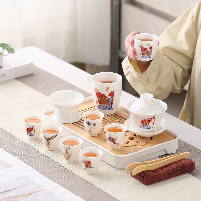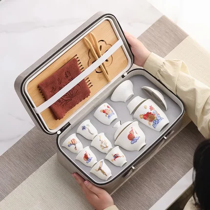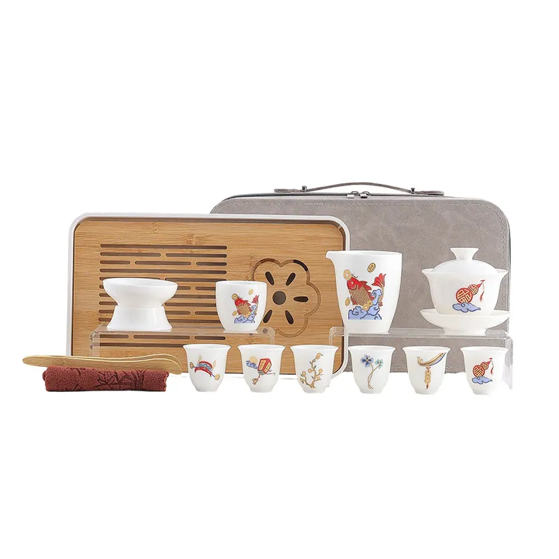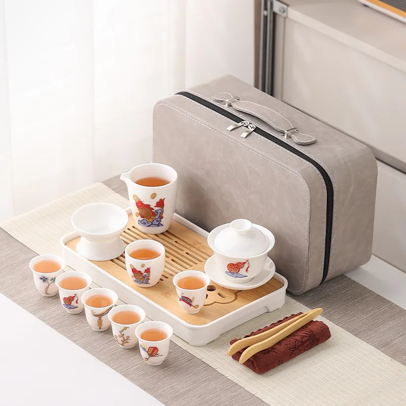 国潮文创羊脂玉旅行茶具套装户外便携家用轻奢白瓷盖碗茶杯一整套