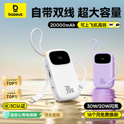 【新国标3C认证】倍思Q电3充电宝2026新款大容量20000毫安快充自带线超薄小巧便携移动电源适用苹果可上飞机