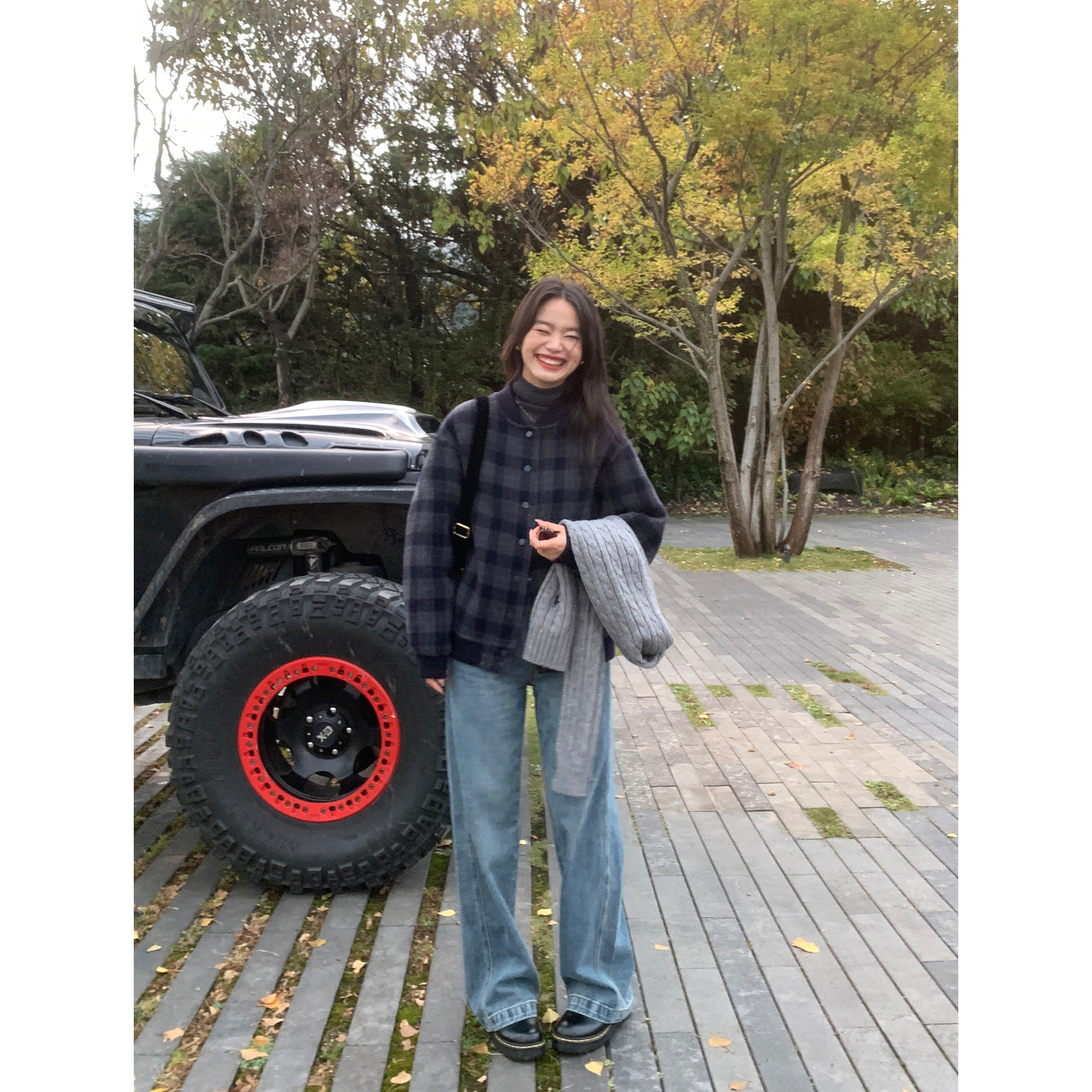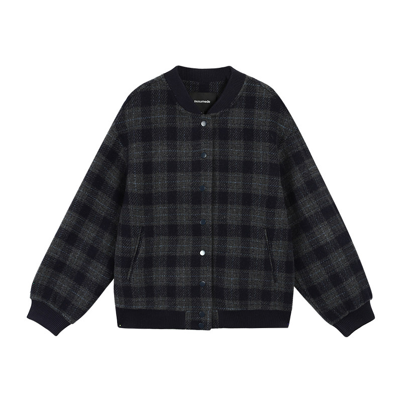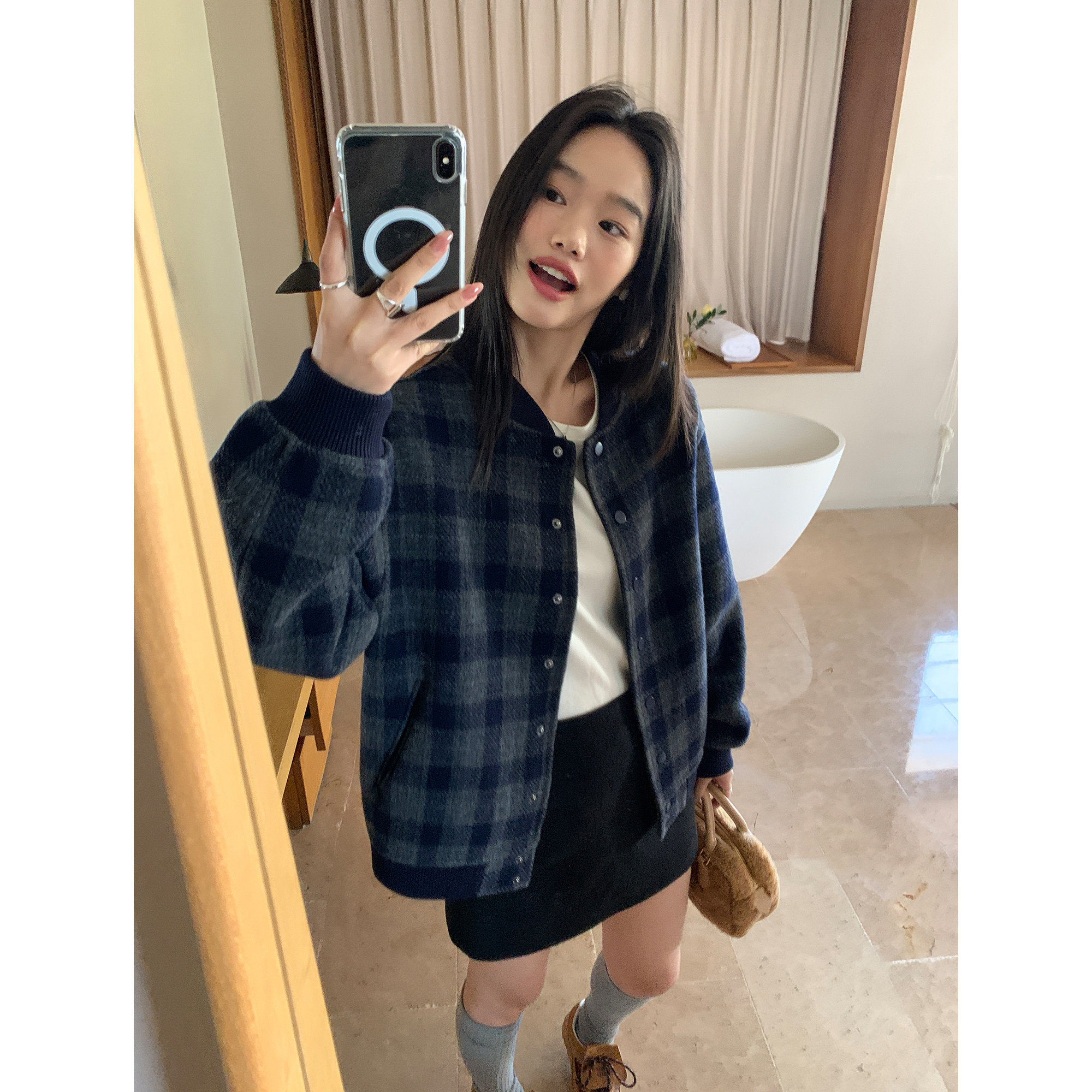 pusumede复古格子棒球服羊毛呢子外套女秋冬新款宽松休闲夹克上衣