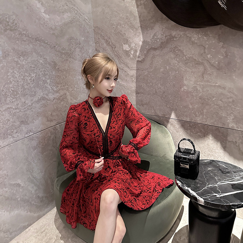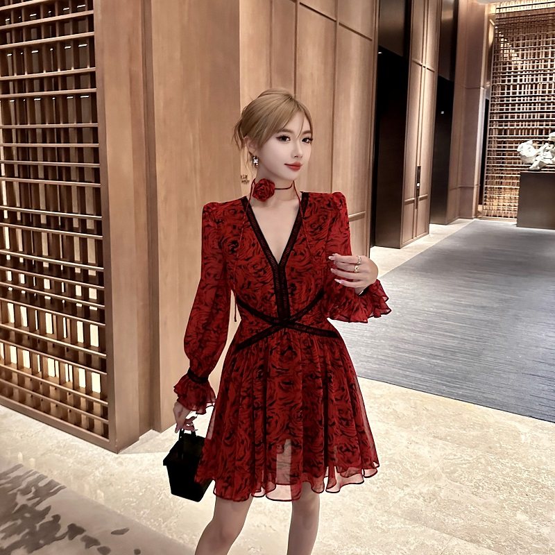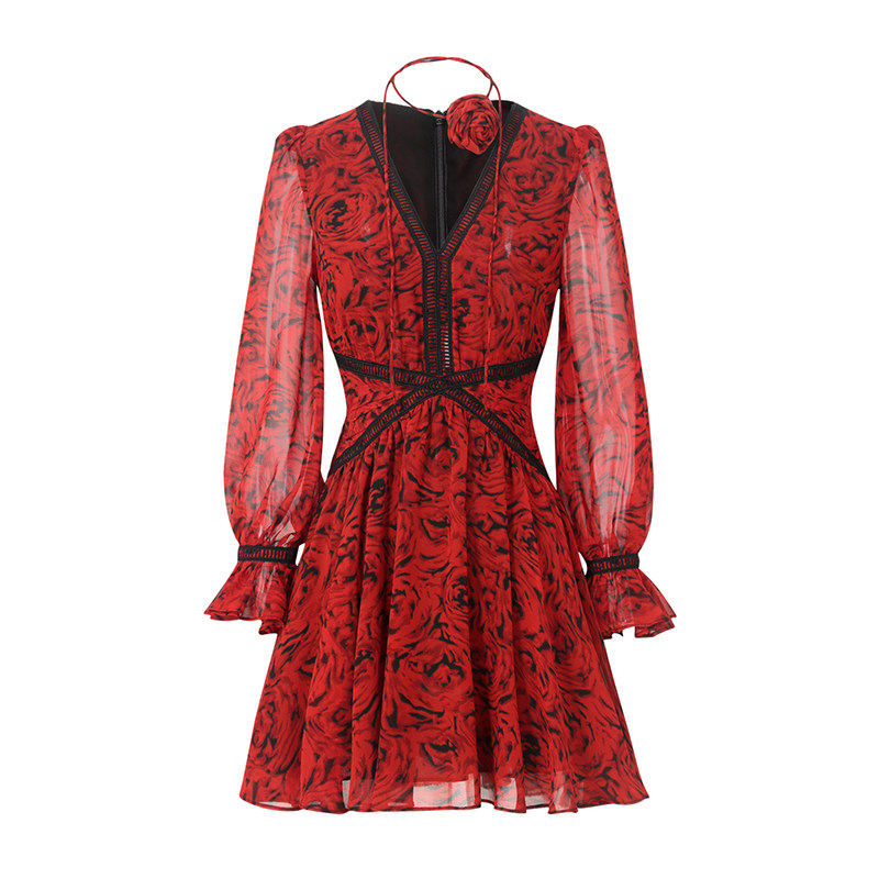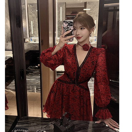 原创设计暗红玫瑰雪纺连衣裙显瘦