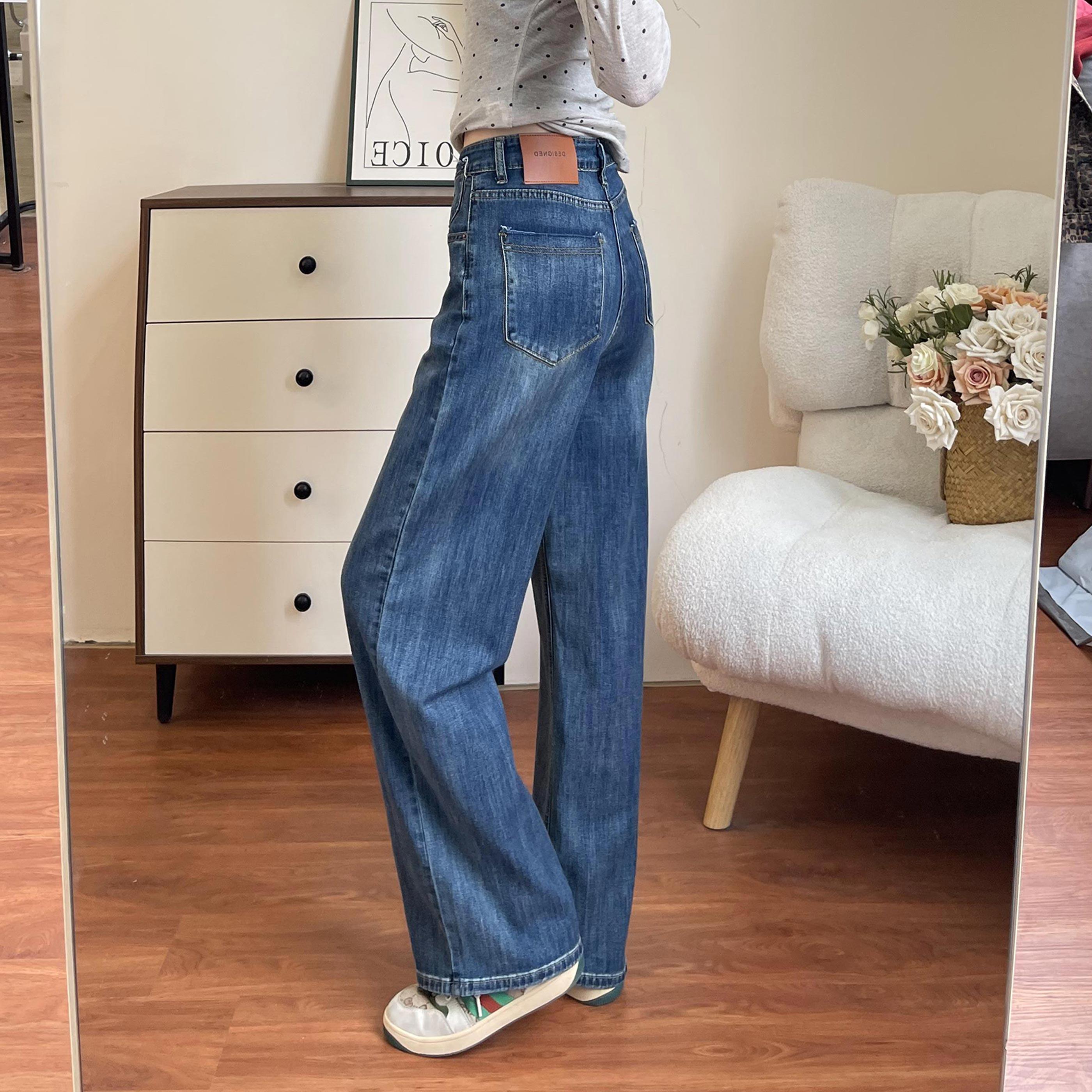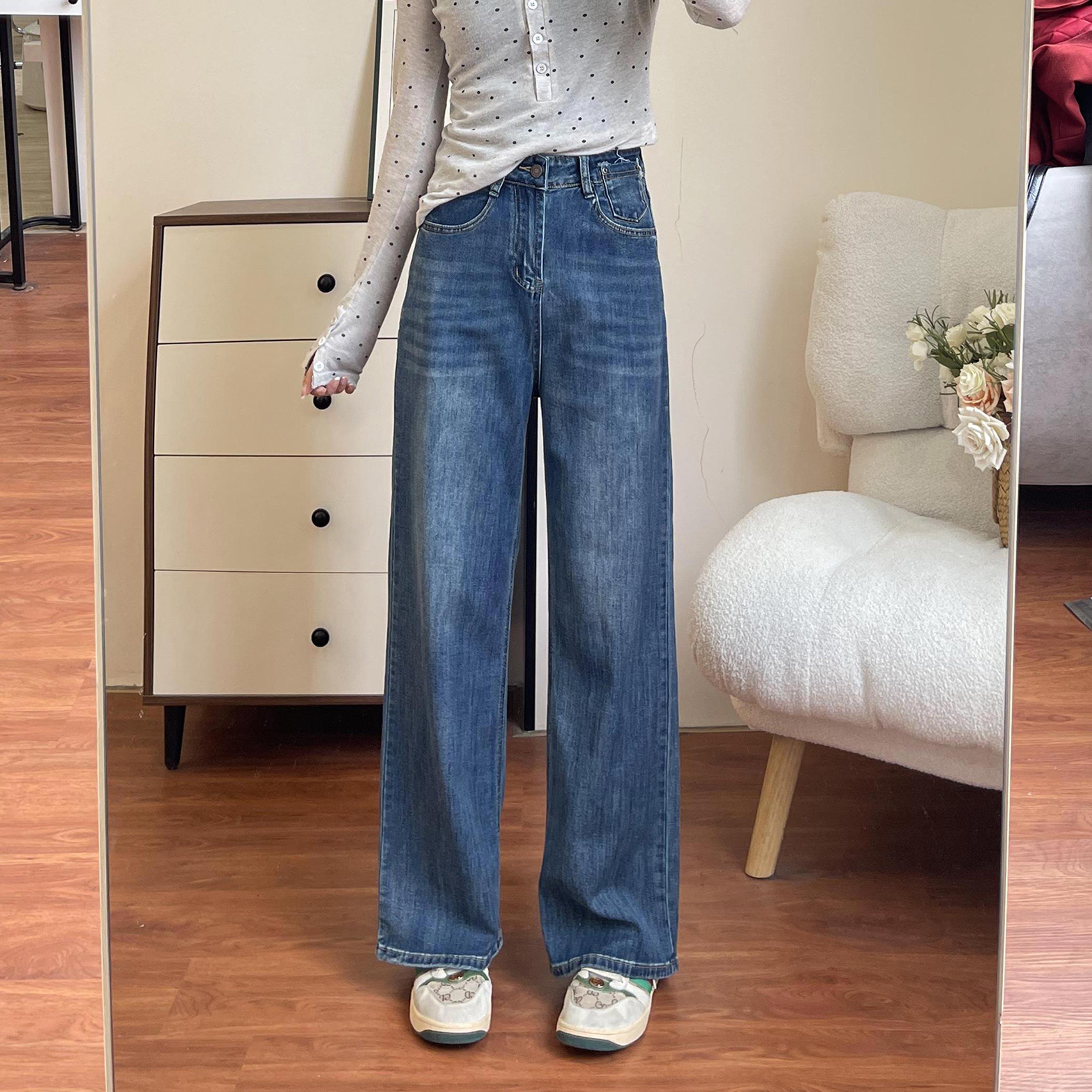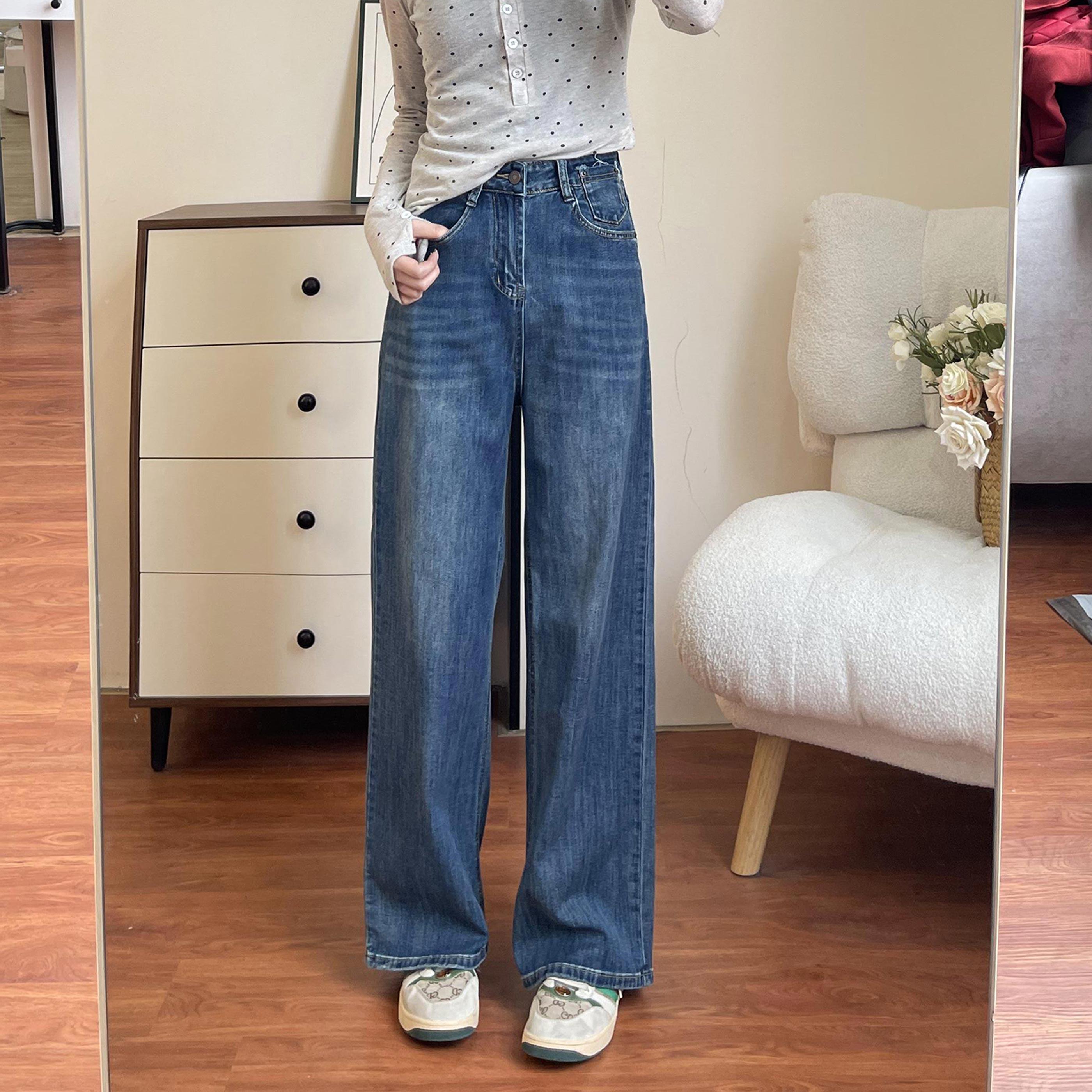 垂感天空蓝阔腿牛仔裤女大码胖MM早春百搭高腰显瘦窄版宽松直筒裤