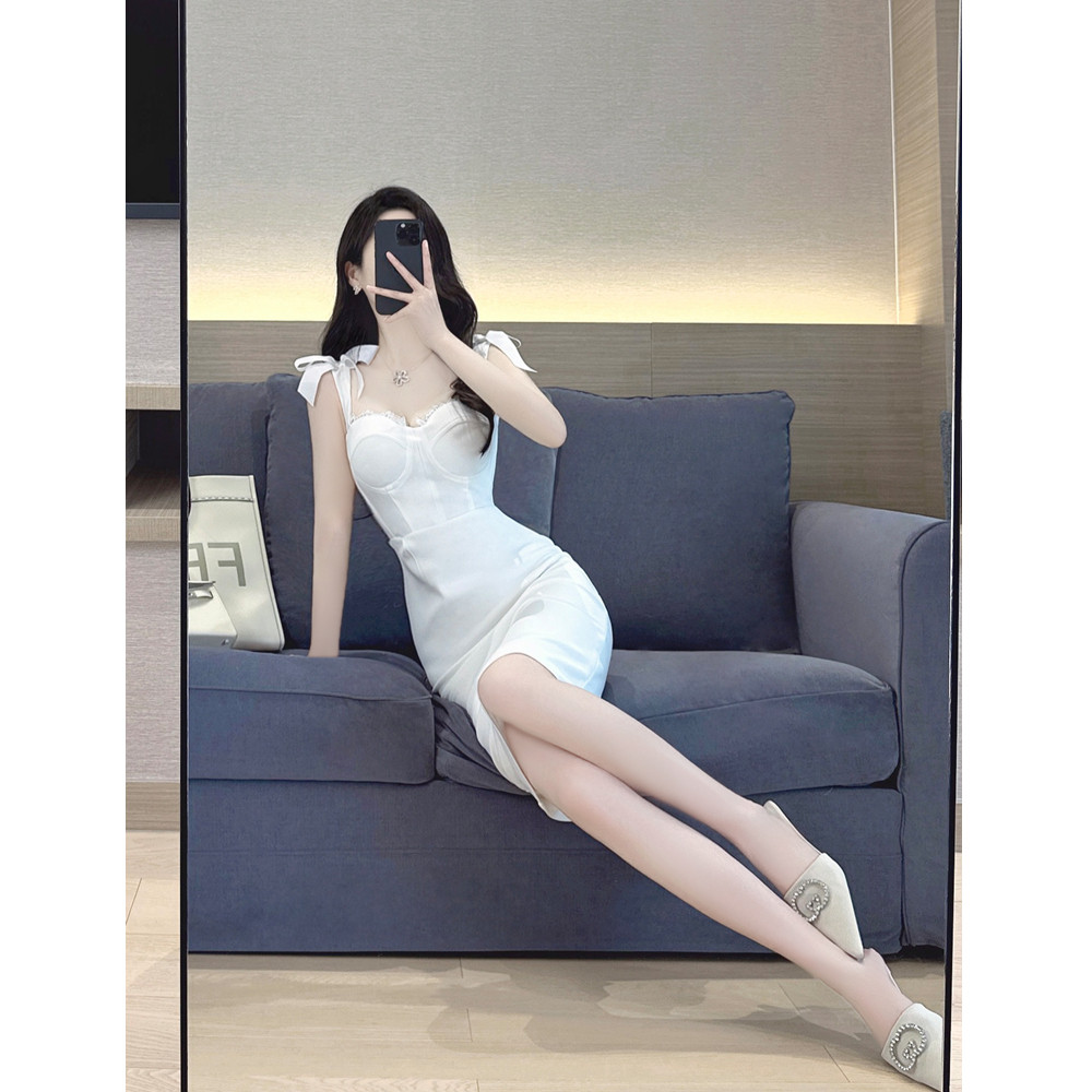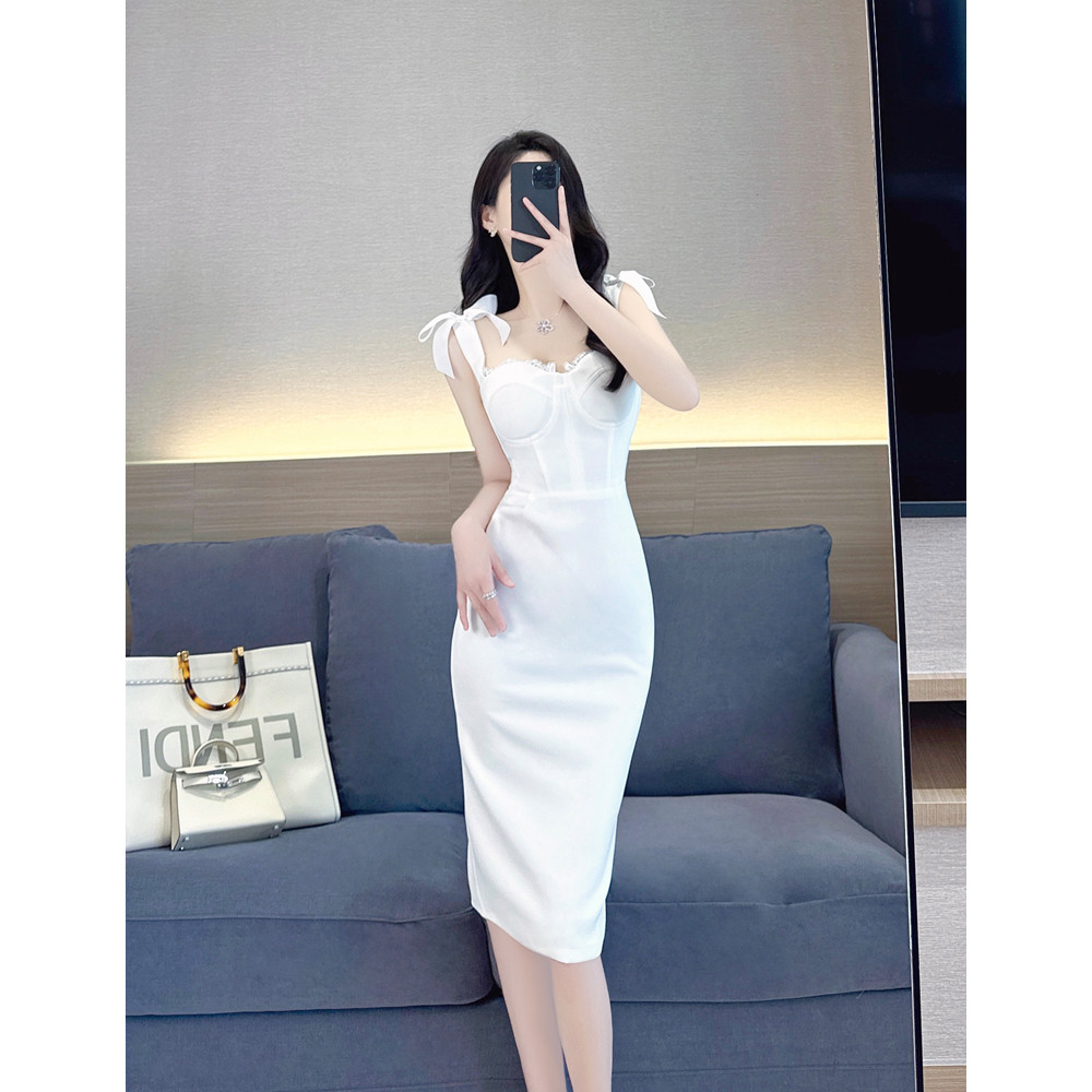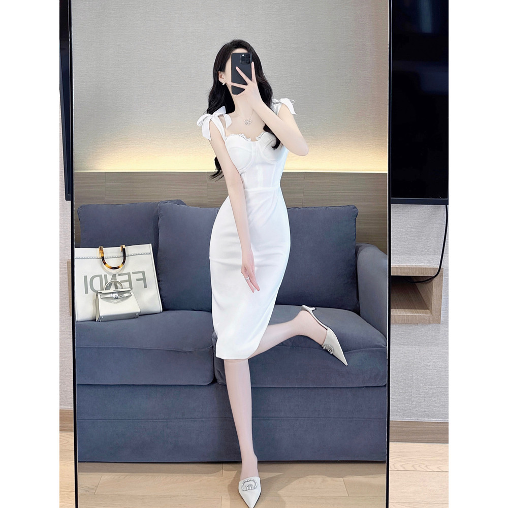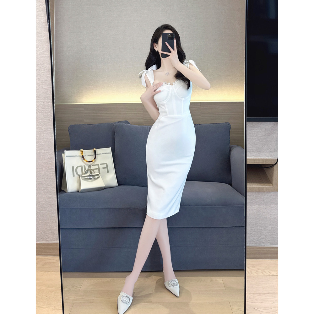白色吊带连衣裙2023新款女高级感气质名媛中长款包臀裙聚会小礼服