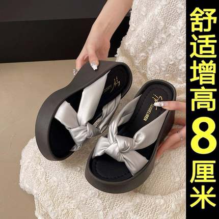 小个子厚底坡跟8cm拖鞋女夏季外穿2025新款时尚网红黑色松糕凉拖