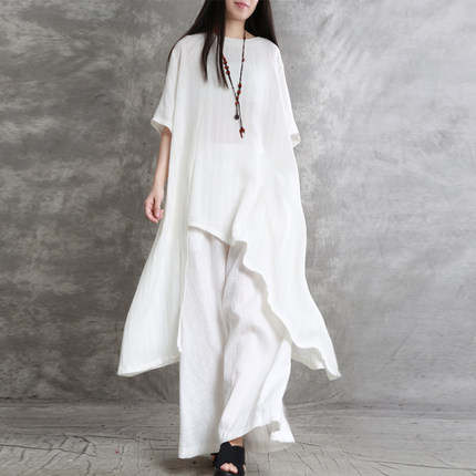 兮风原创大码个性不规则棉麻套装女长款显瘦白衬衣百搭阔腿裤春夏