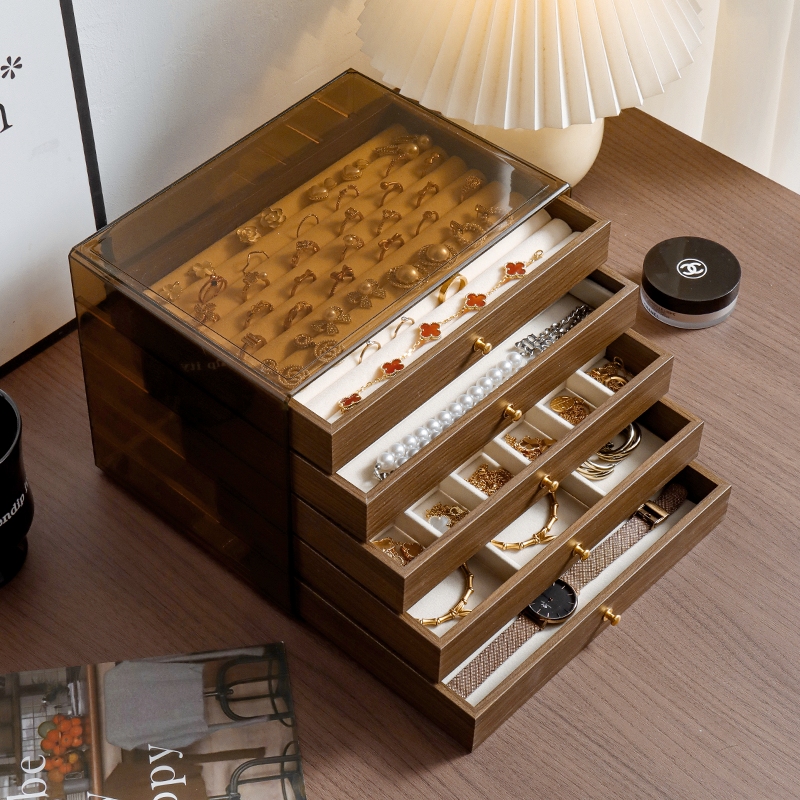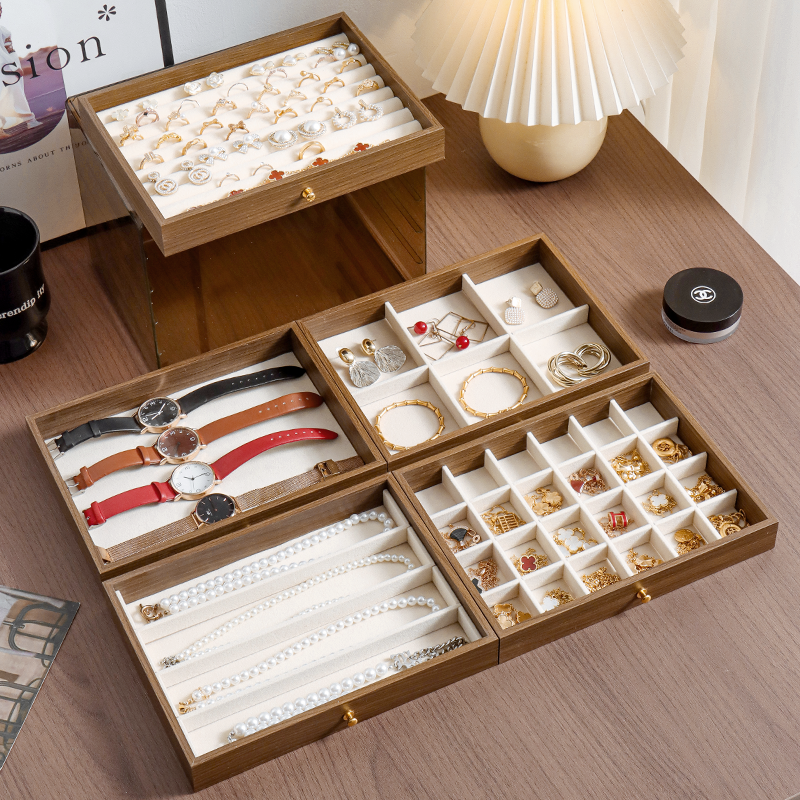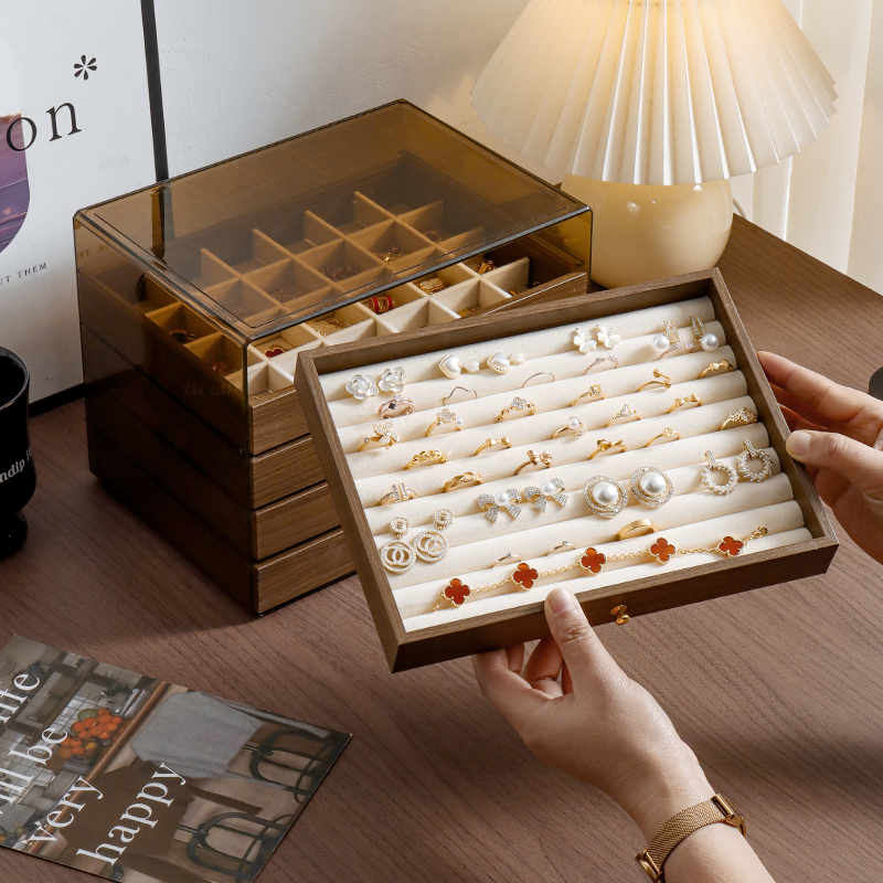 首饰收纳盒轻奢高档胡桃木纹耳环耳钉项链戒指复古防氧化饰品盒
