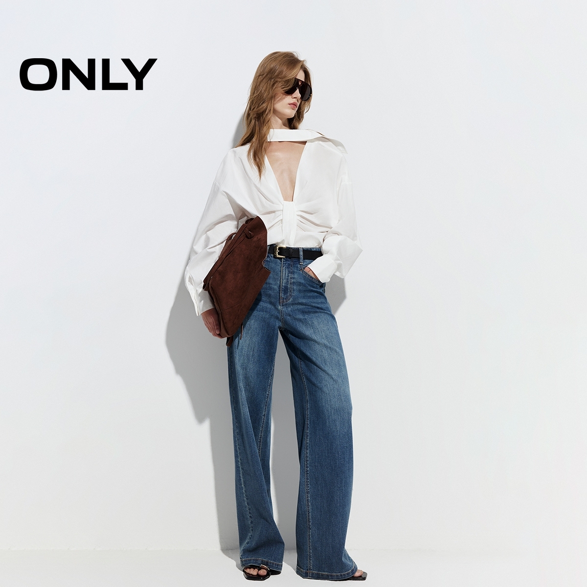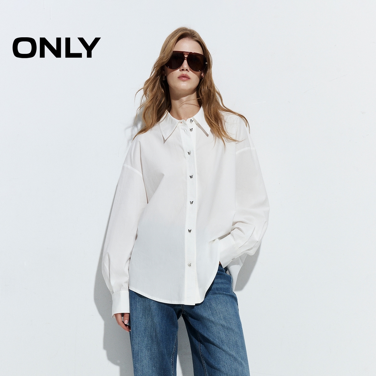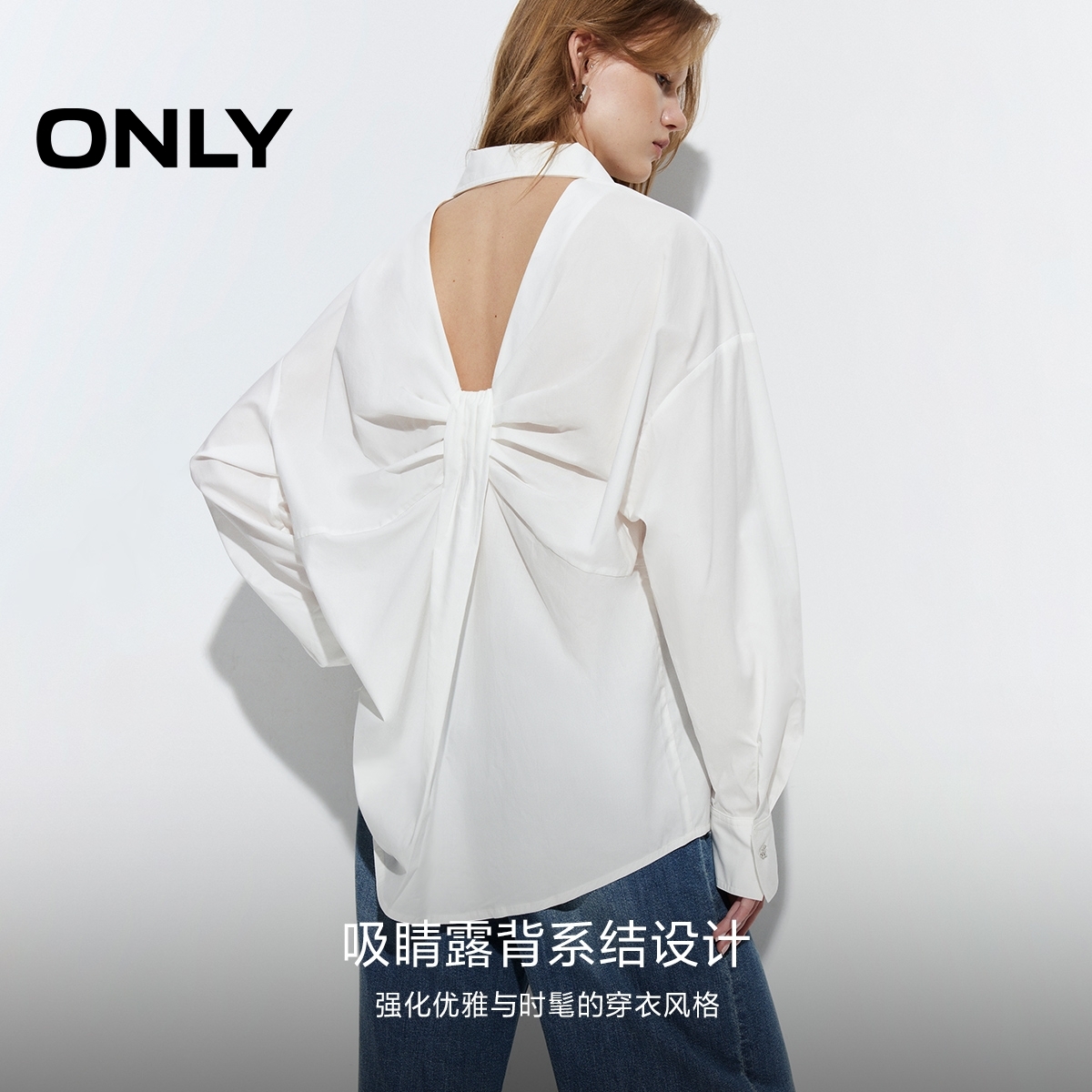 ONLY2025秋季新款时髦露背两穿蝴蝶立体纽扣白色落肩宽松衬衫女
