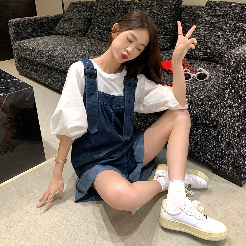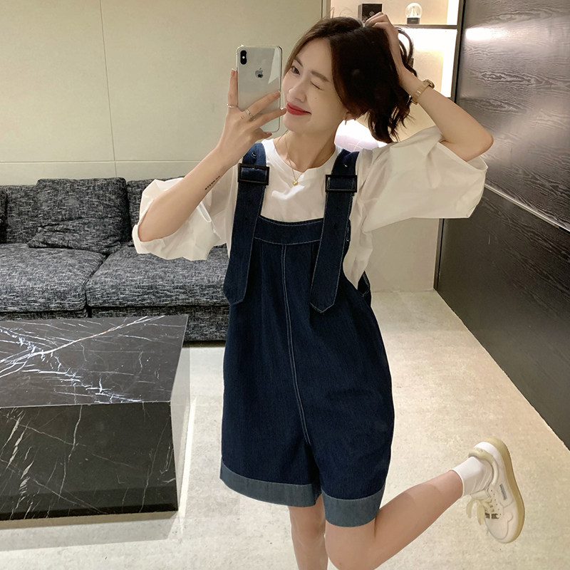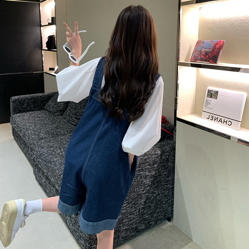 大码牛仔背带裤女夏季2023新款高腰宽松阔腿短裤卷边遮胯显瘦裤子