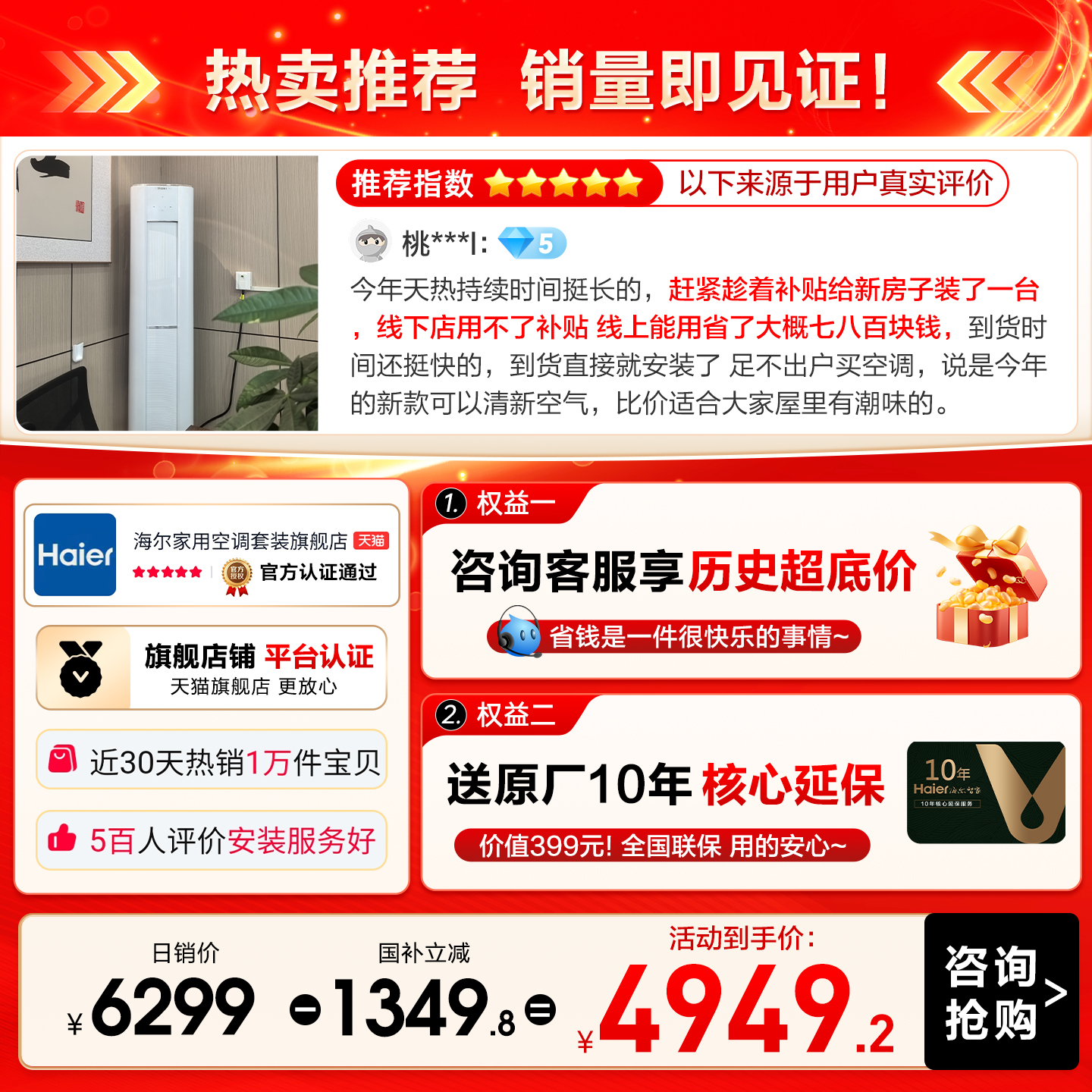 【国补20%】海尔洗空气空调3匹一级变频家用客厅立式柜机E3旗舰店