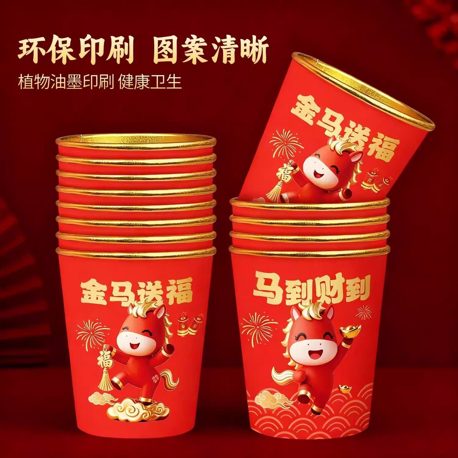 新年一次性纸杯2026年马年过年喜庆家用杯子加厚金箔水杯春节喜杯