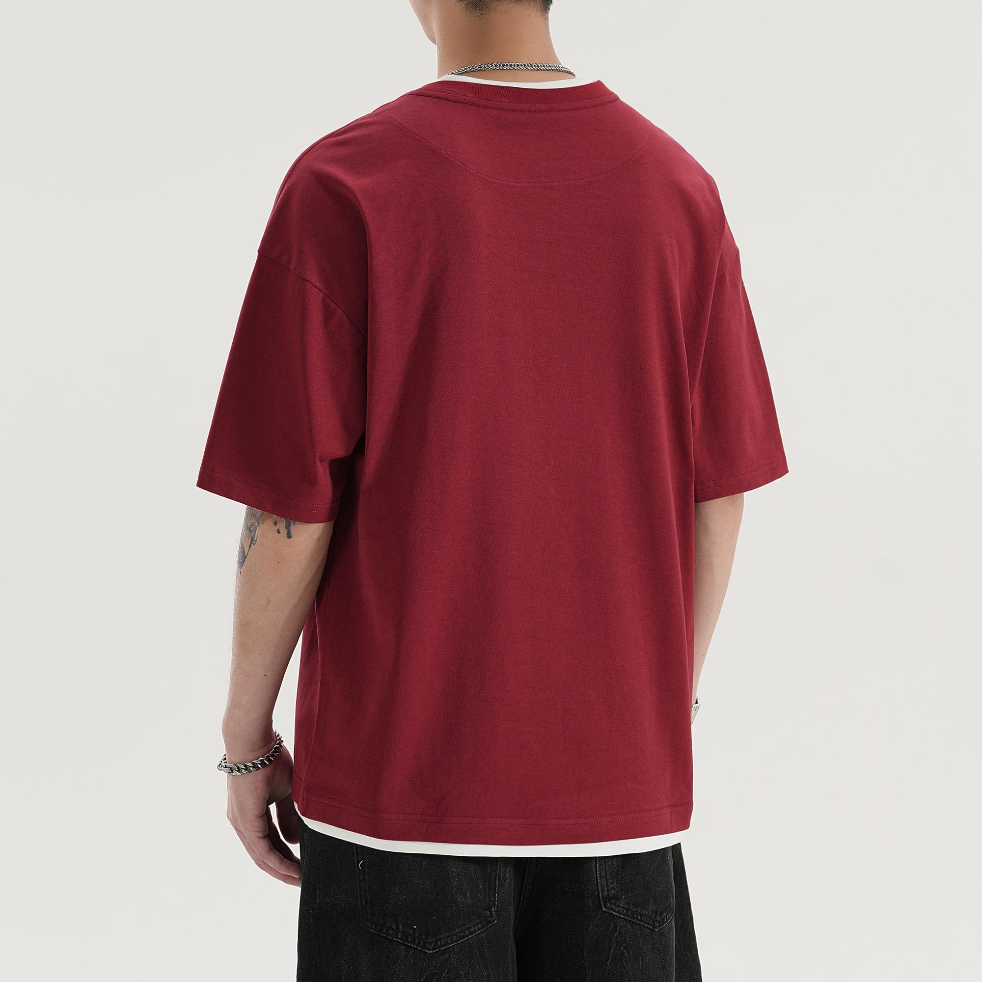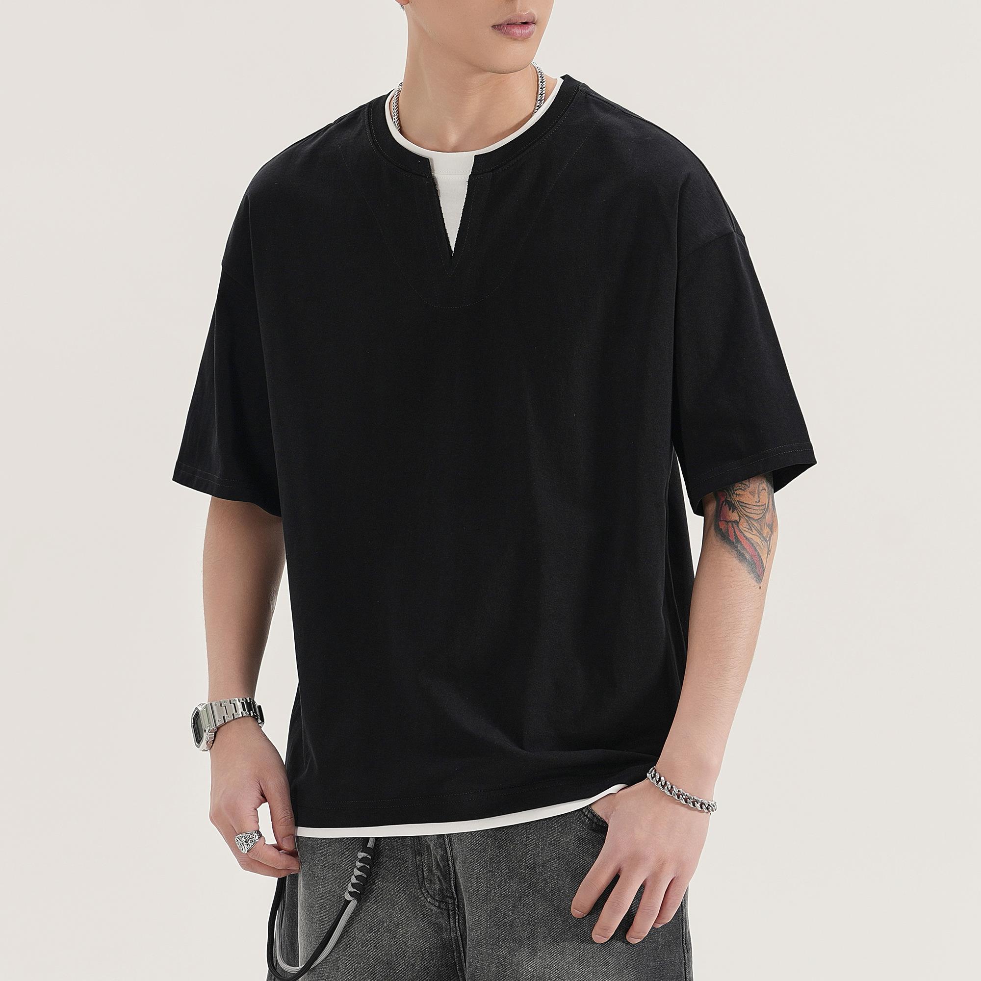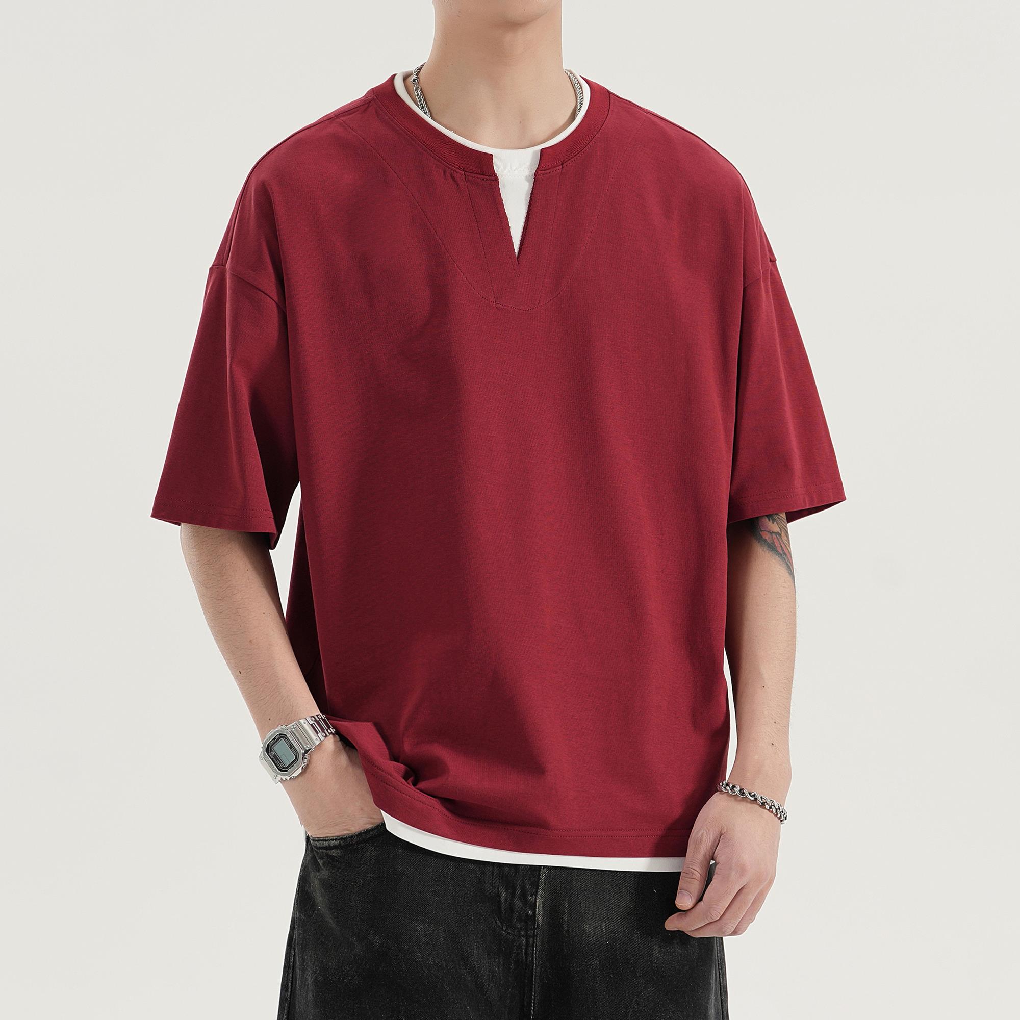 美式假两件V领短袖t恤男夏季新款宽松纯棉休闲百搭潮牌上衣