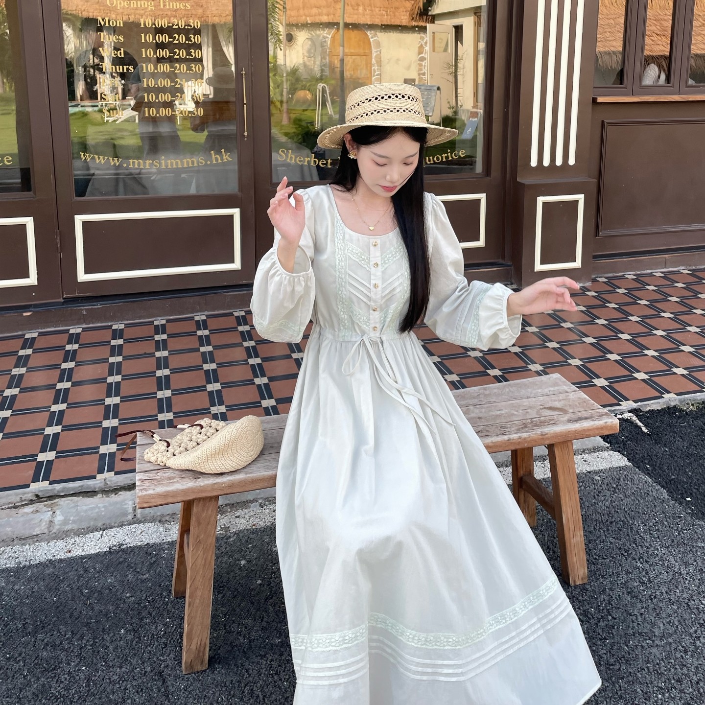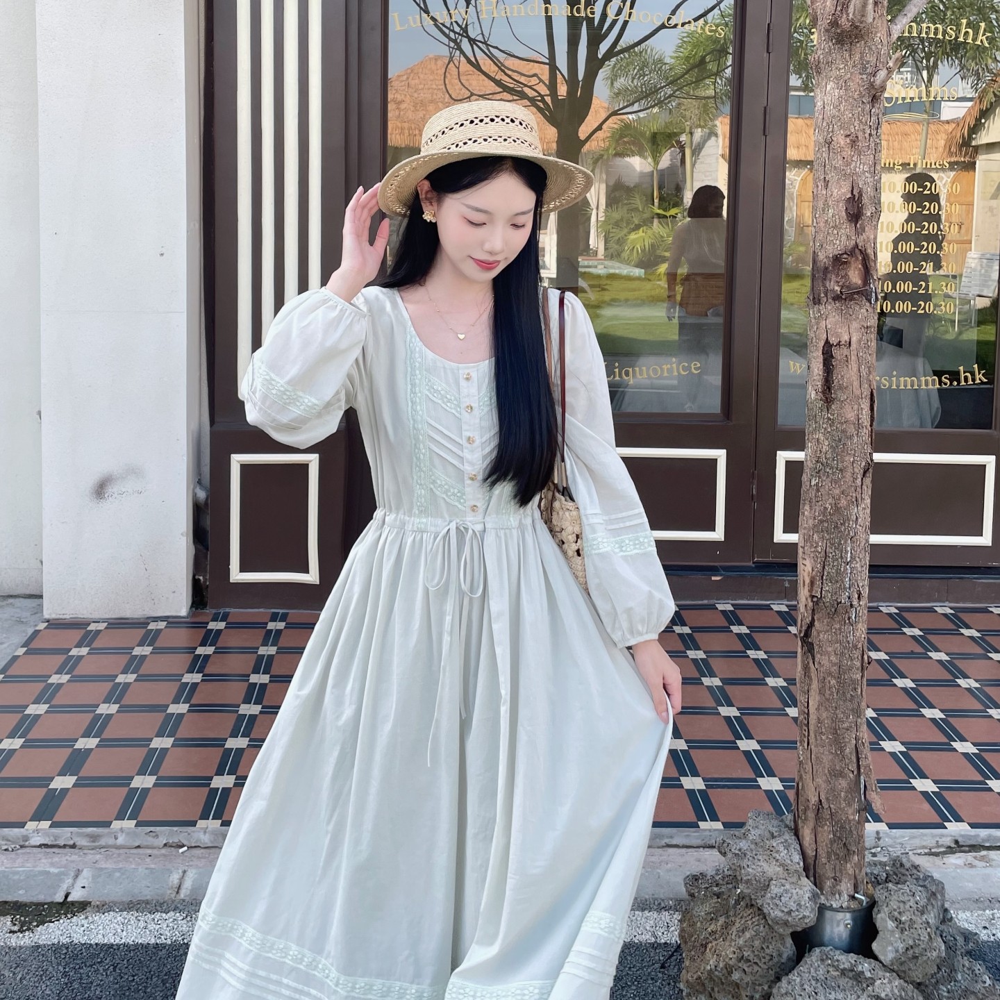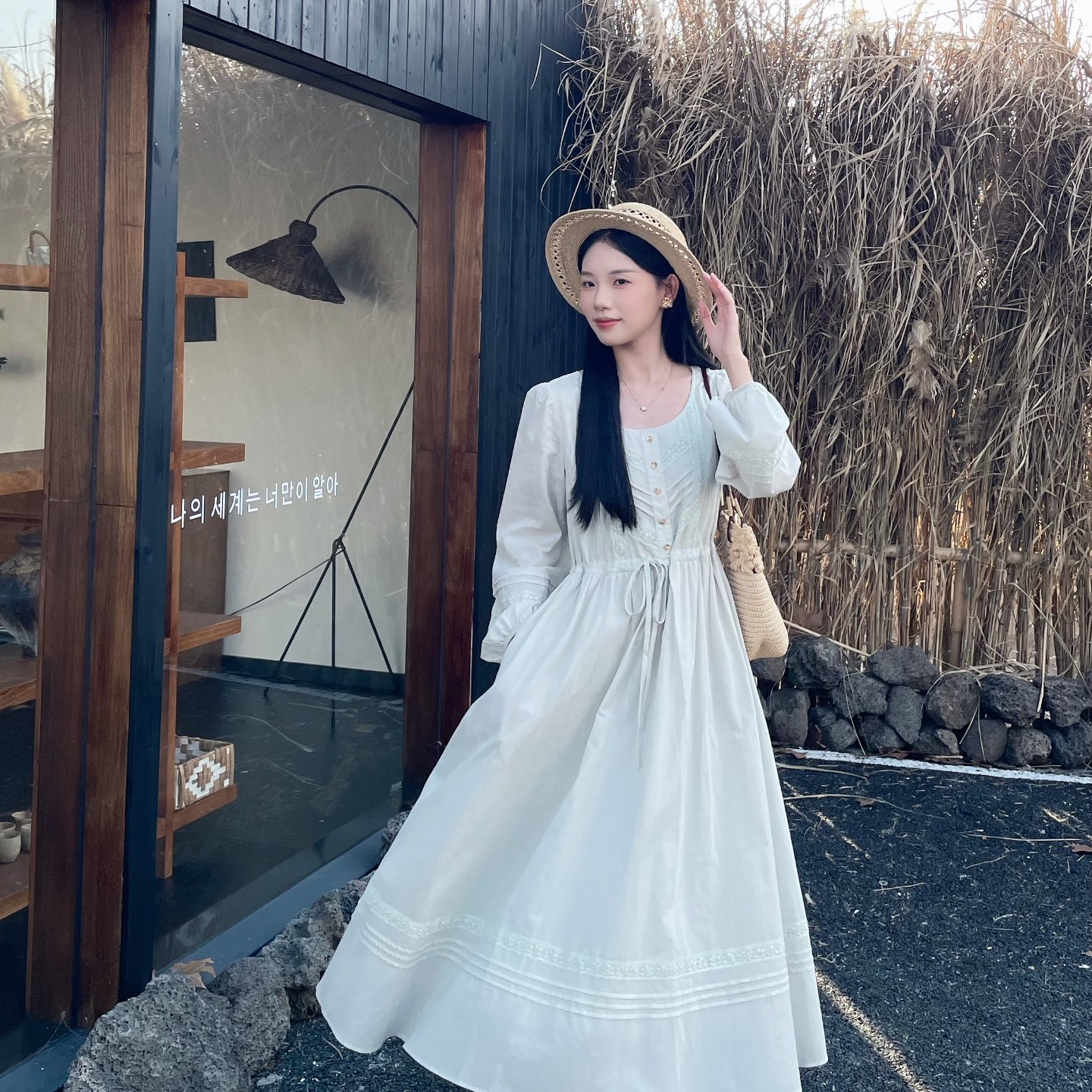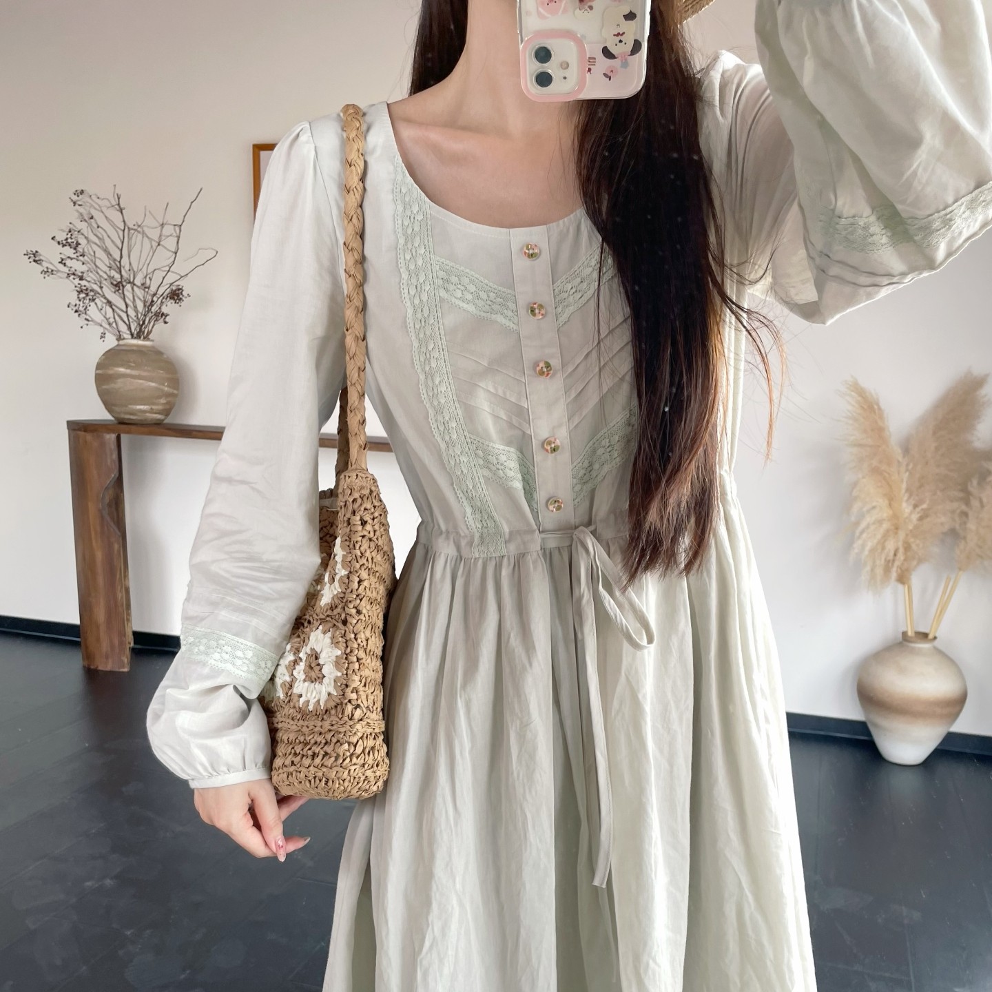 复古圆领蕾丝拼接文艺长袖连衣裙