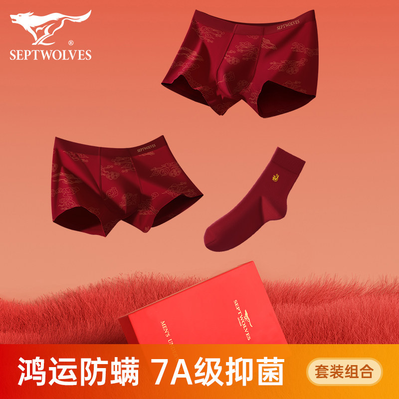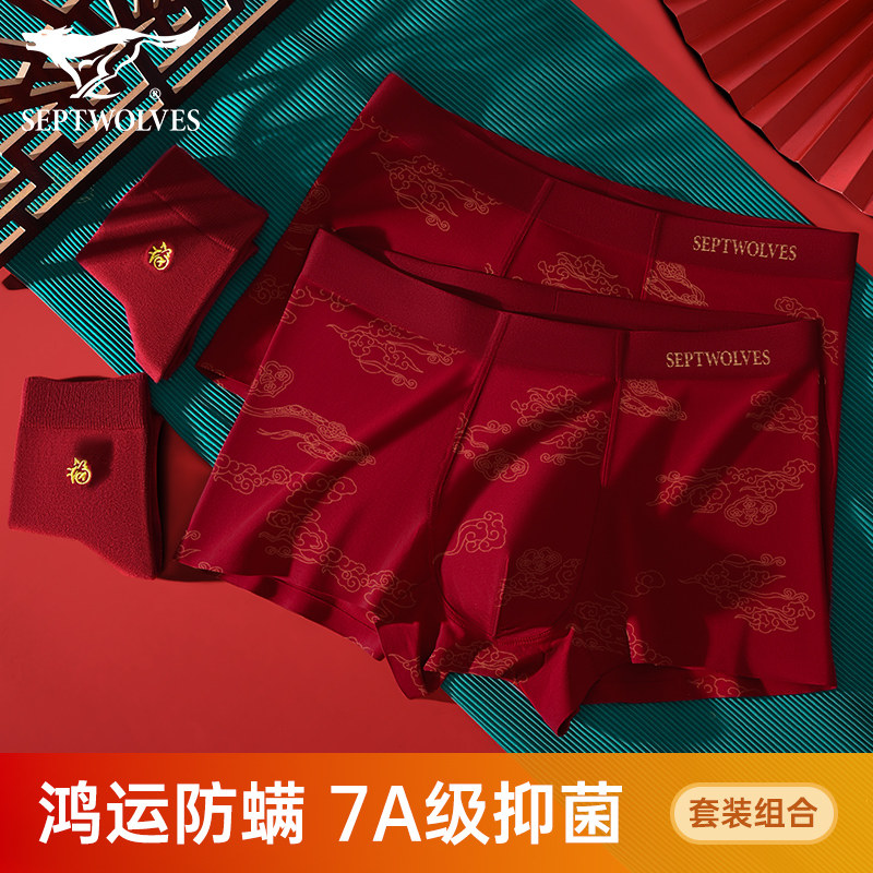 七匹狼男士内裤红色本命年四角短裤新款结婚礼物纯棉抗菌男生裤头