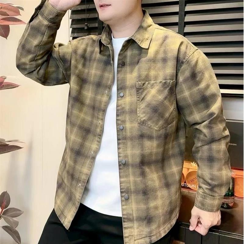 品质潮牌牛仔格子衬衫翻领秋季男士修身休闲时尚潮流韩V版长袖外