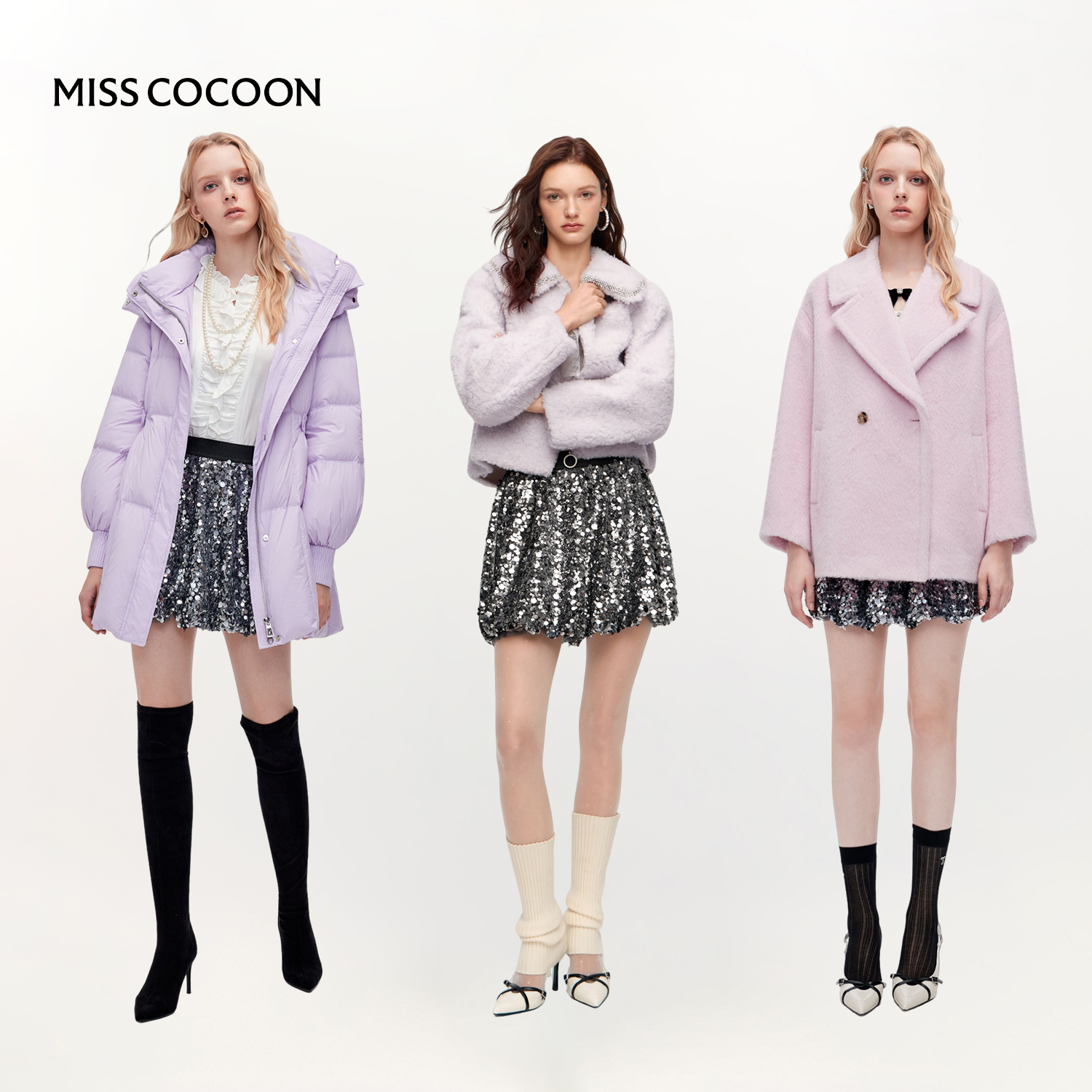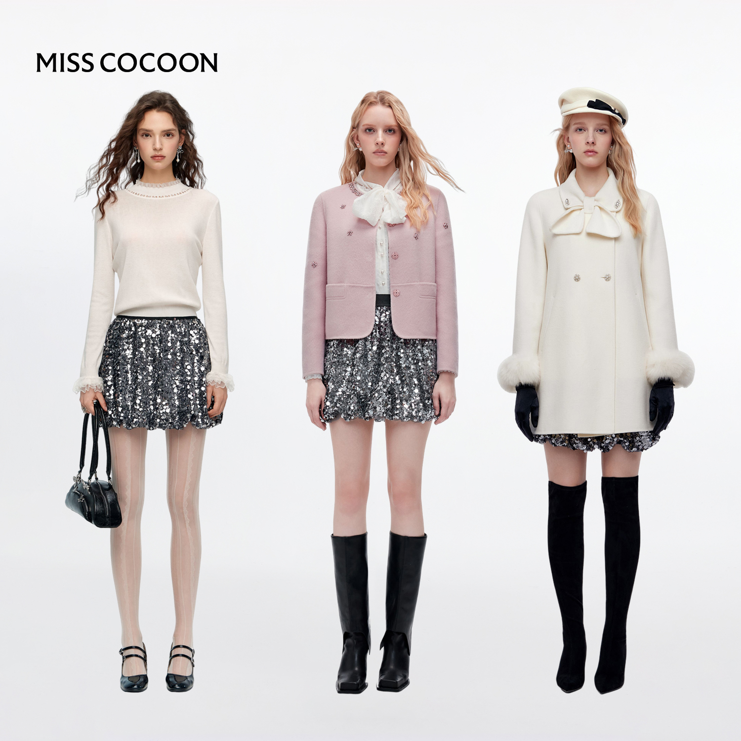 MISSCOCOON可可尼灰色亮片短裙女2025秋冬新款复古时尚花苞半身裙