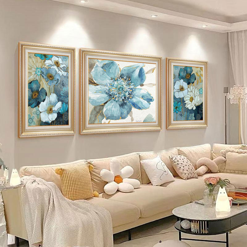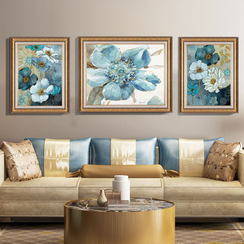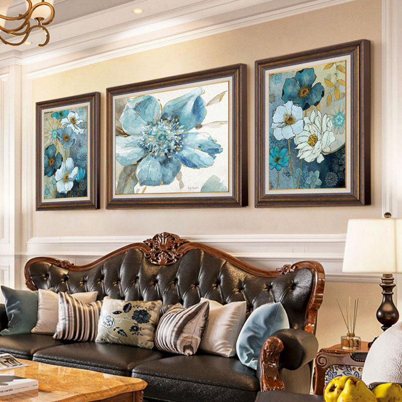 美式客厅装饰画欧式简欧沙发背景墙三联画蓝色系花卉墙画餐厅挂画
