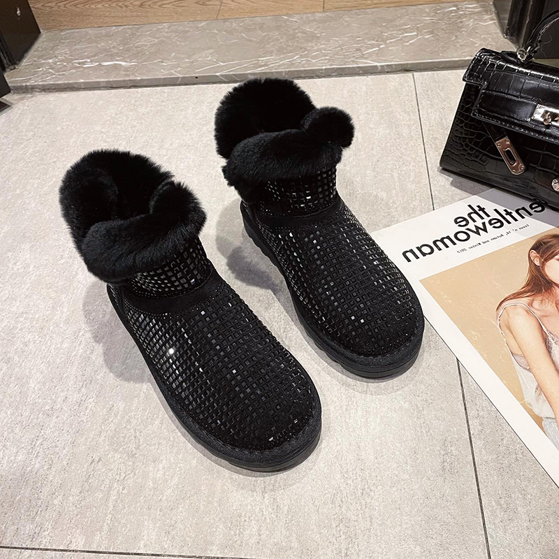 水钻雪地靴2024年冬季新款时尚百搭圆头兔毛加绒棉靴子女平底短靴