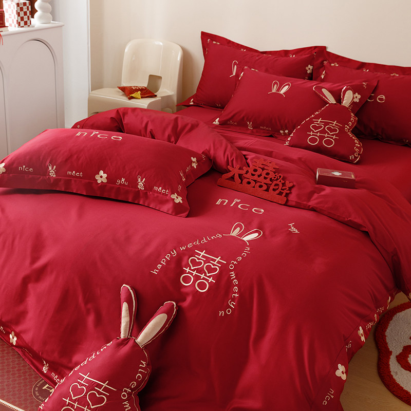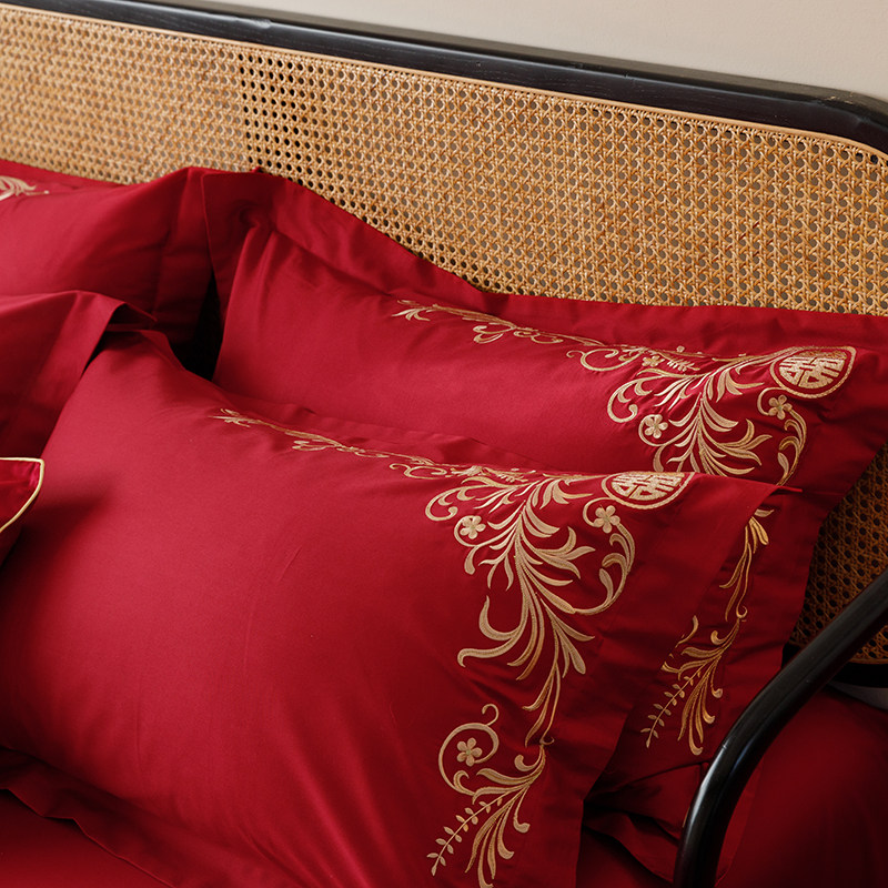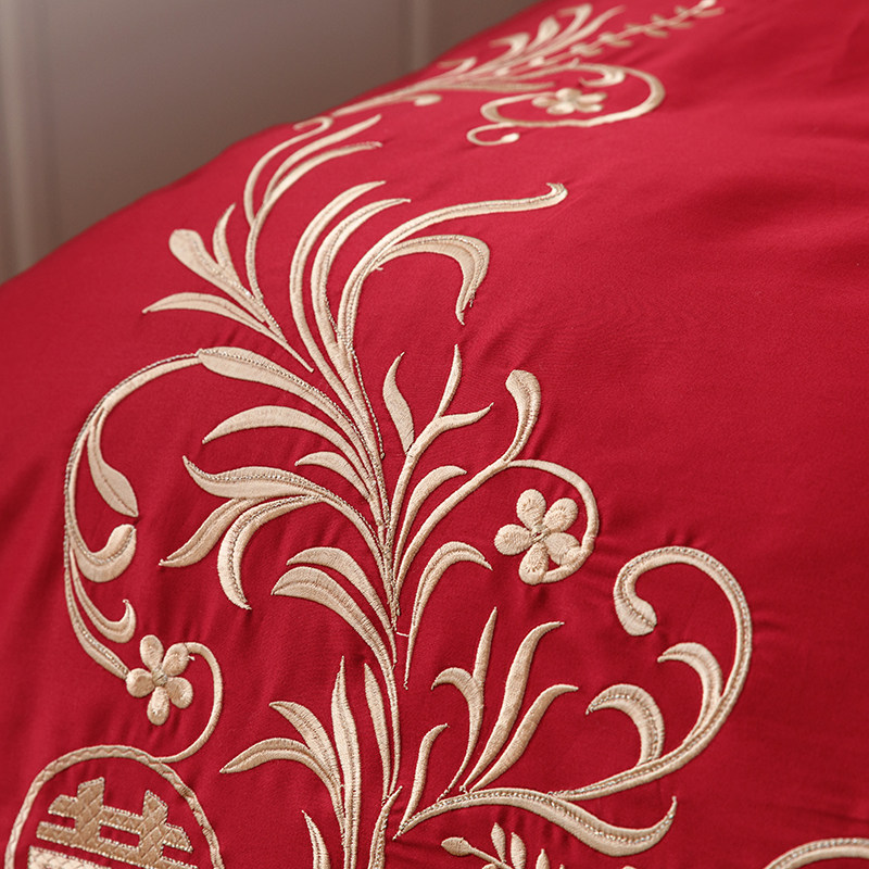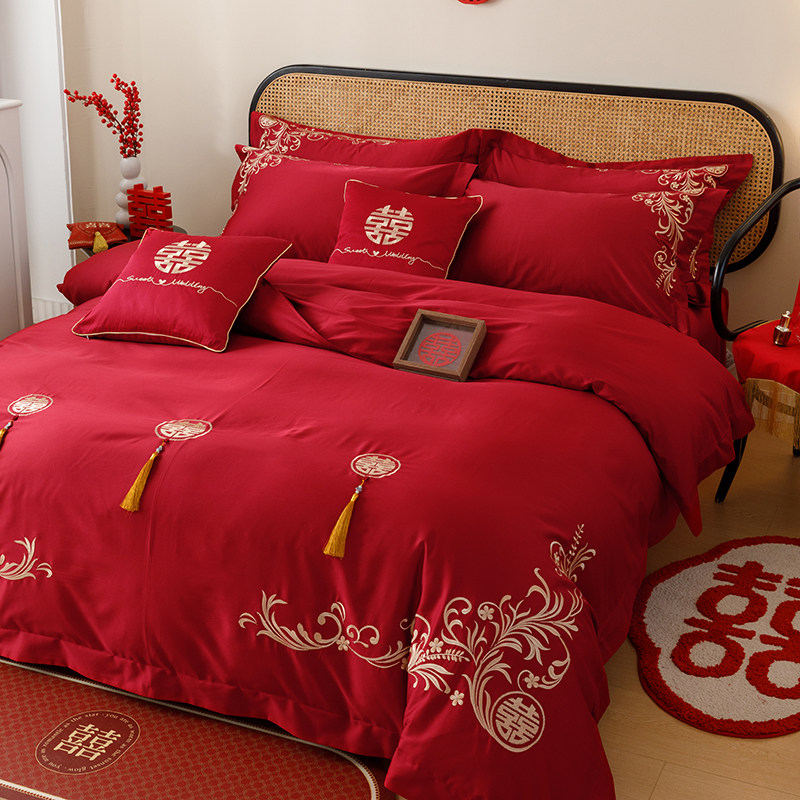 100支婚庆纯棉四件o套刺绣红色被套全棉中式结婚床单婚嫁床上用品