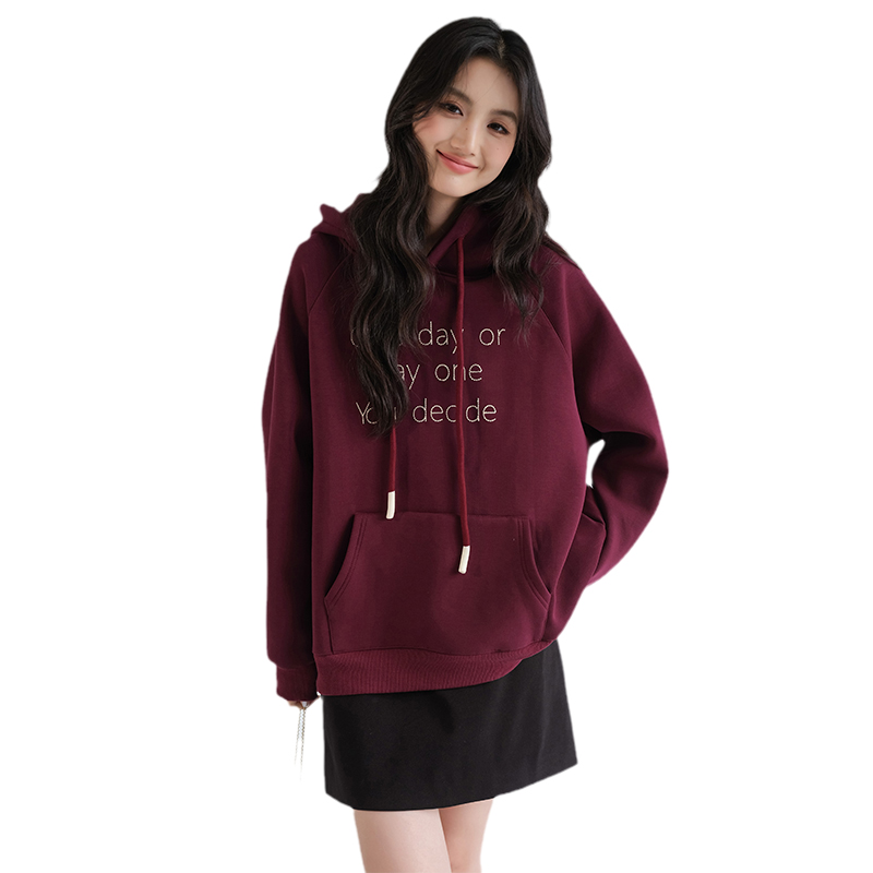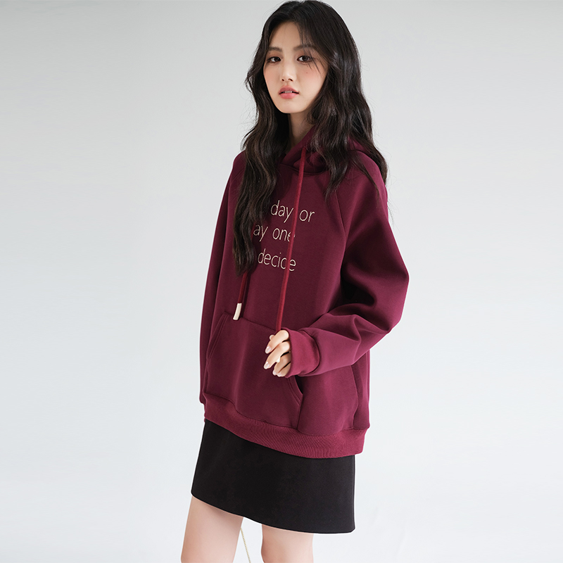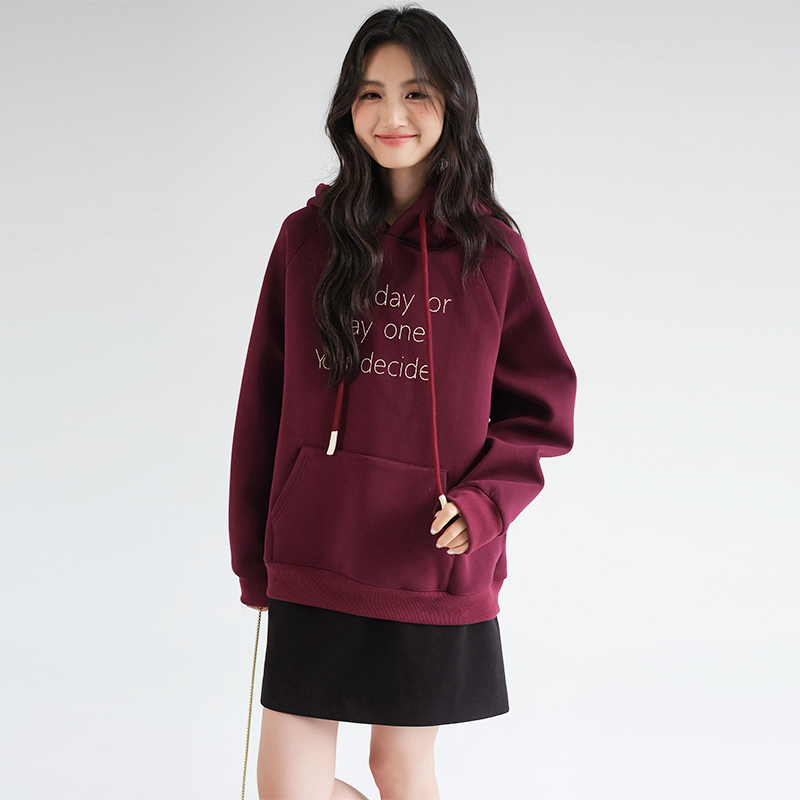 蓝若水大码女装字母刺绣连帽薄绒卫衣胖mm秋季新款慵懒风宽松上衣