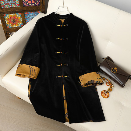 2025春秋季新款新中式国风中长款丝绒风衣高端盘扣复古旗袍女外套