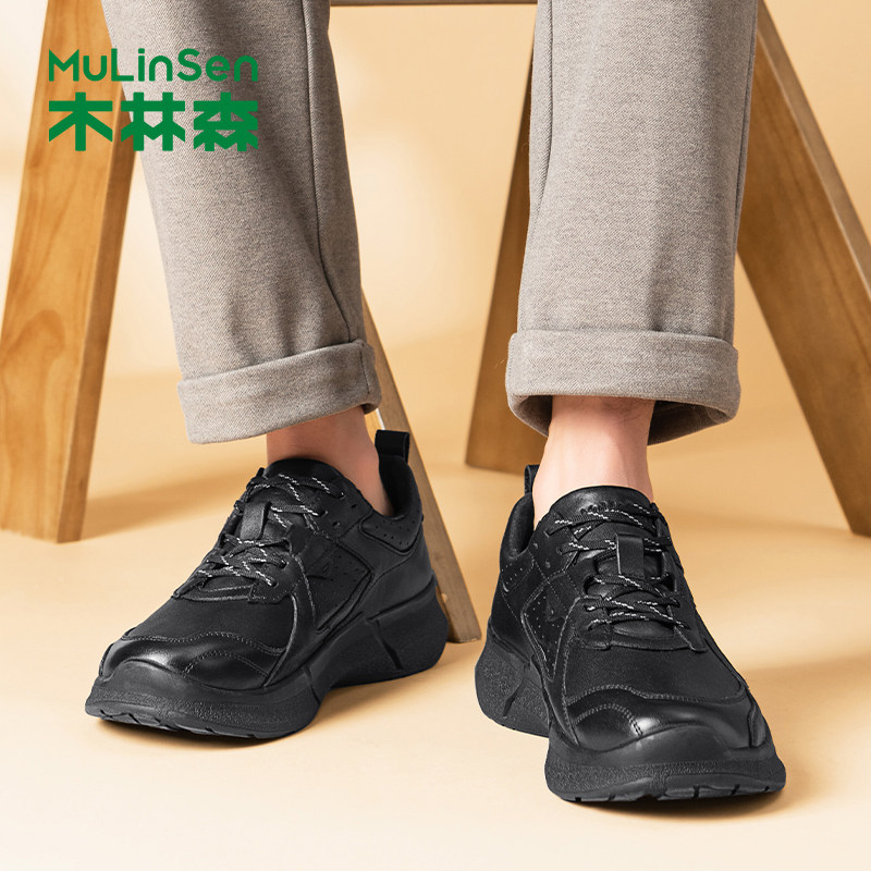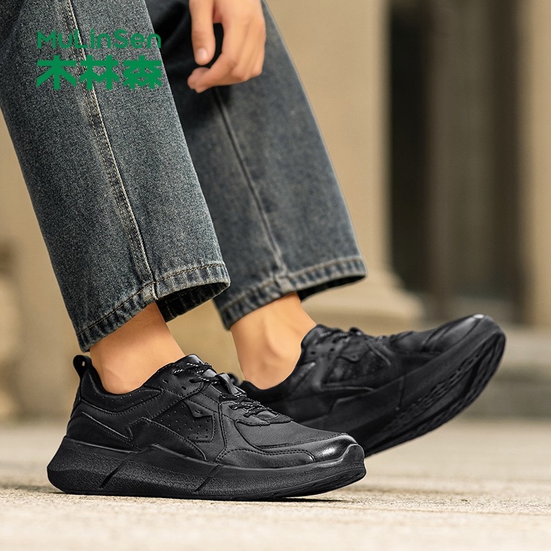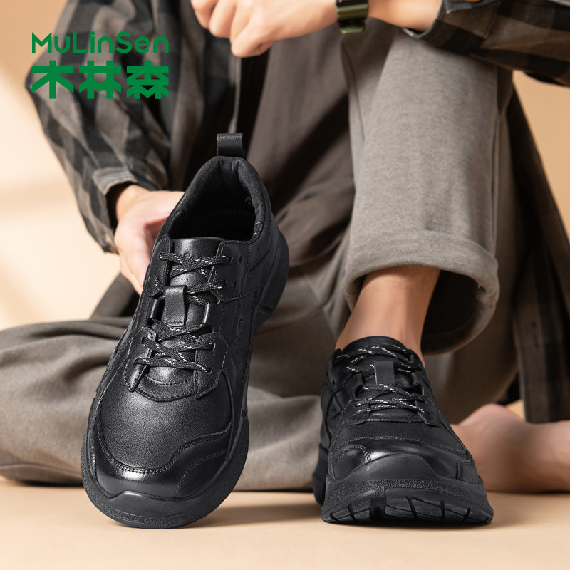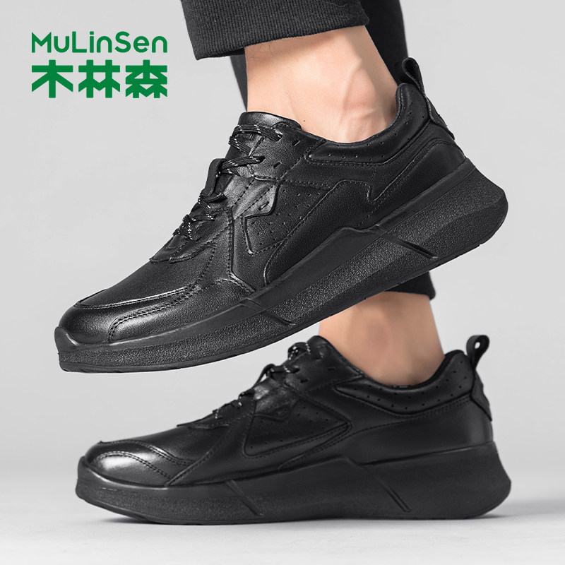 木林森男鞋真皮休闲皮鞋男黑色百搭耐磨软底舒适运动跑步鞋轻便潮