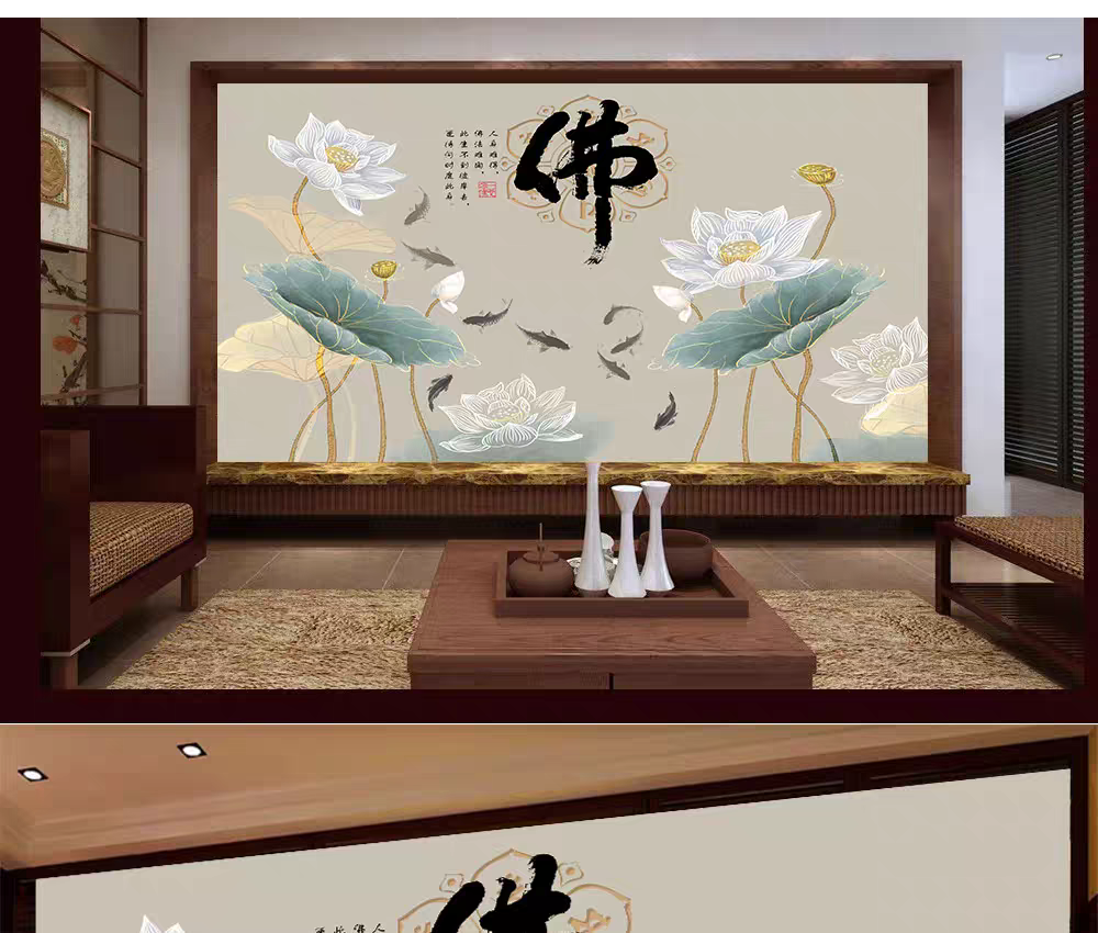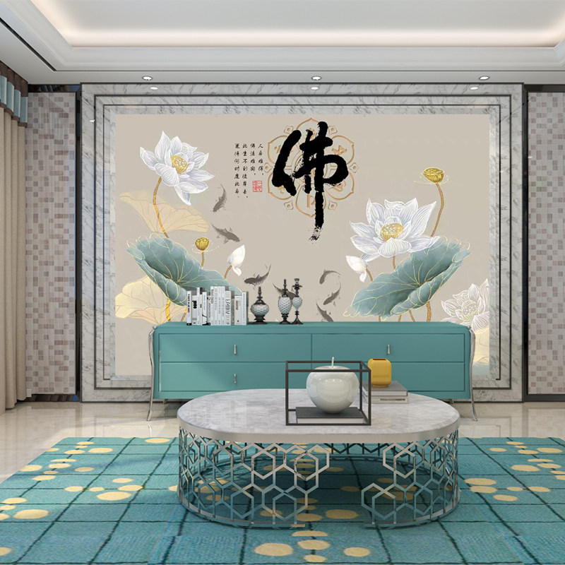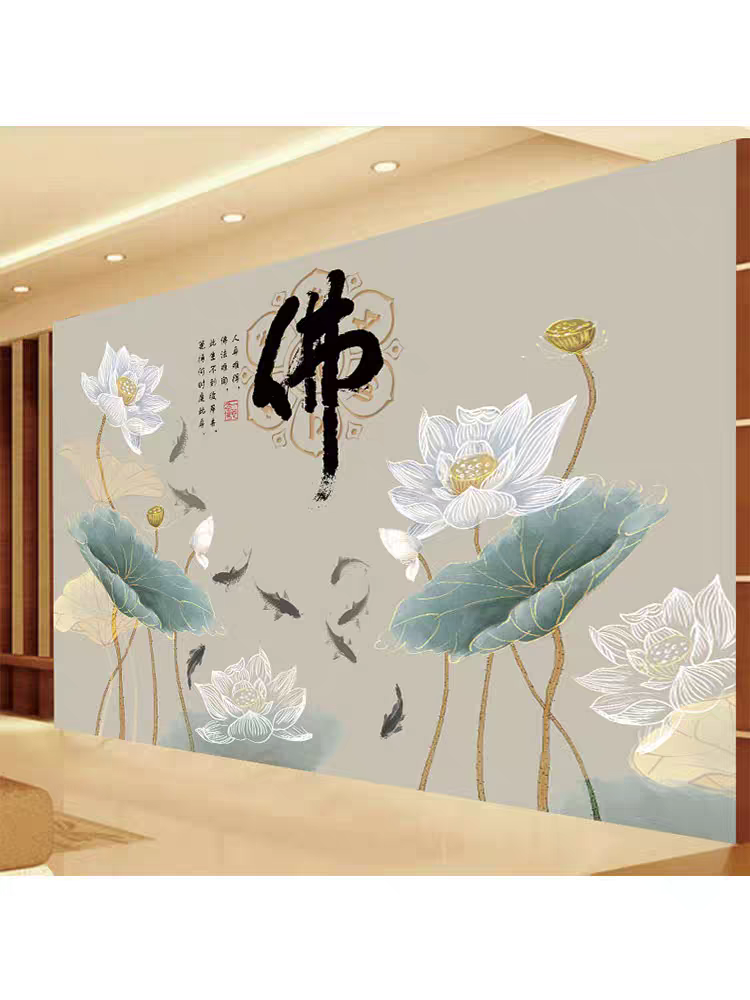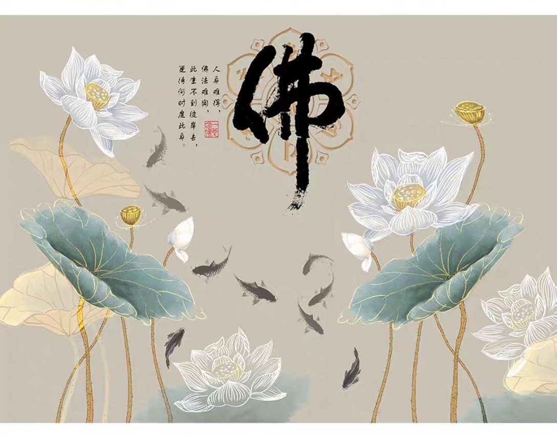现代中式佛经壁纸莲花禅意墙纸荷花佛字佛堂佛台客厅背景墙壁画