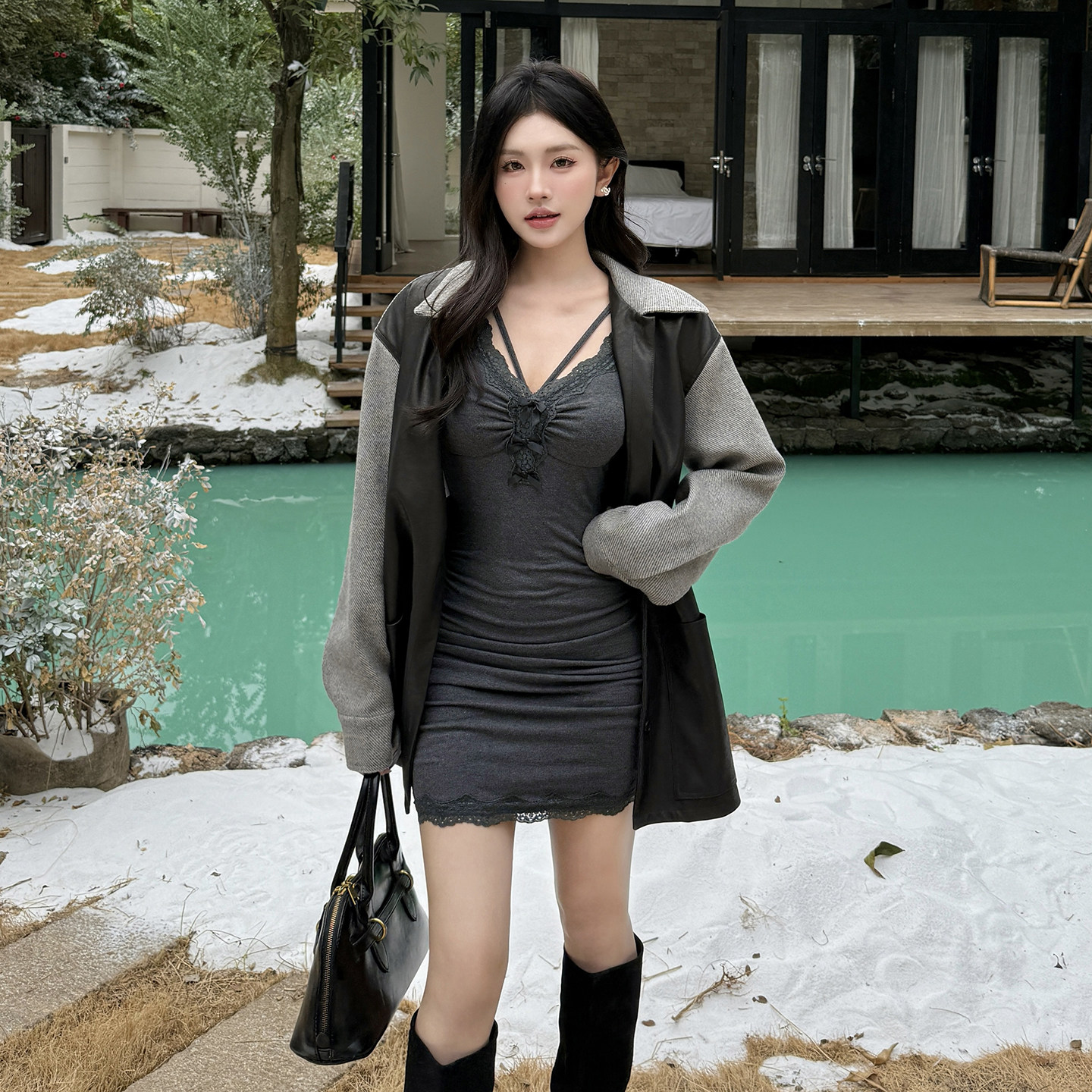 GirlsAt18灰色性感蕾丝V领长袖连衣裙女秋冬新款修身内搭包臀短裙