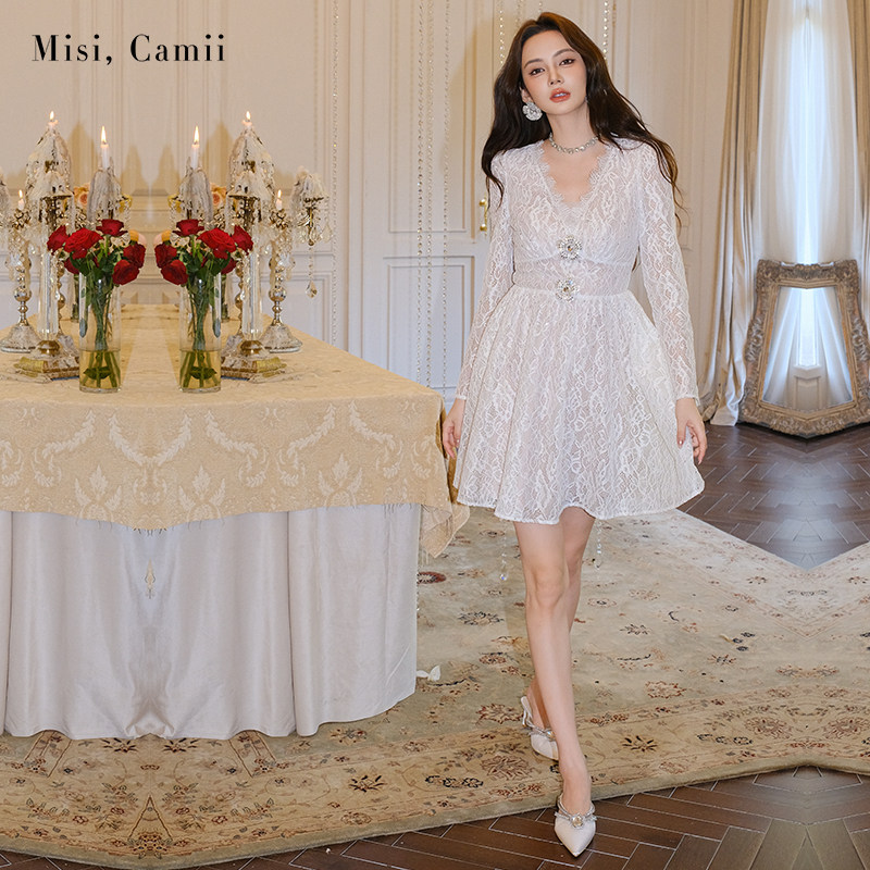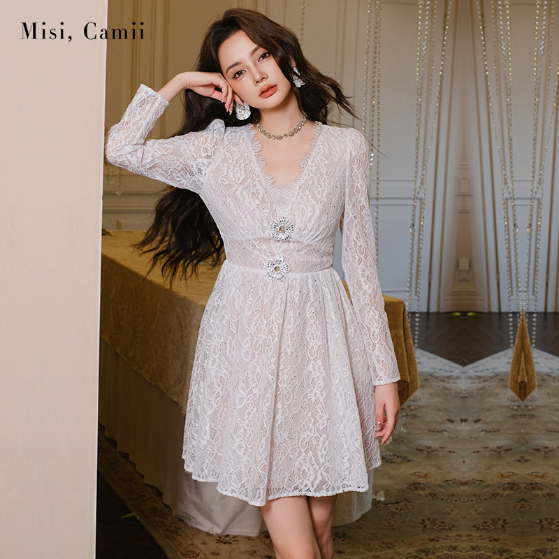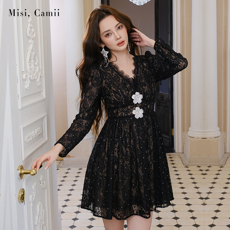 Misi.Camii2025早秋新款女装立体花烫钻蕾丝连衣裙性感气质名媛风
