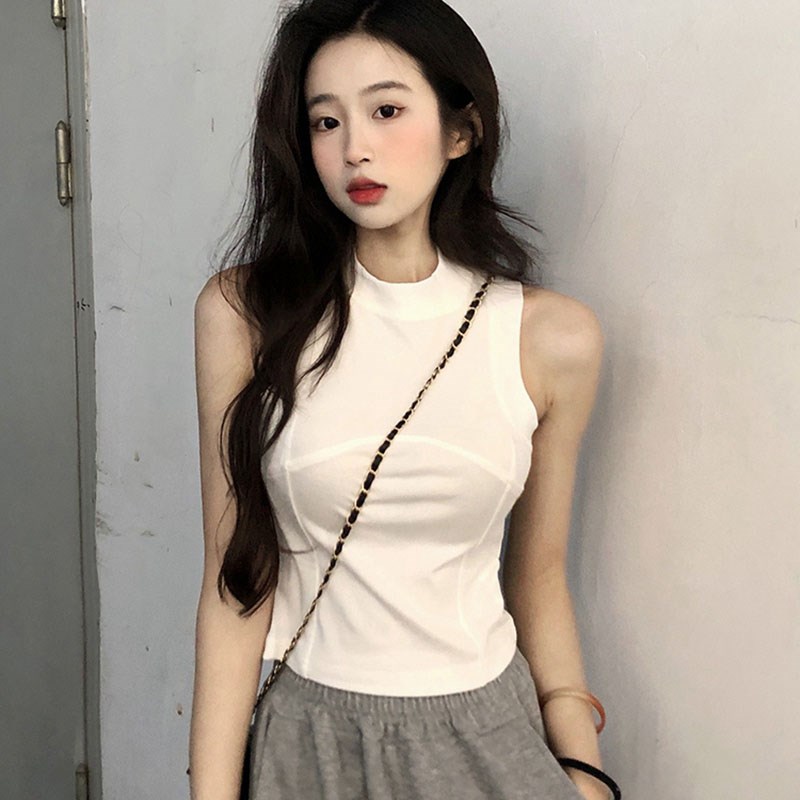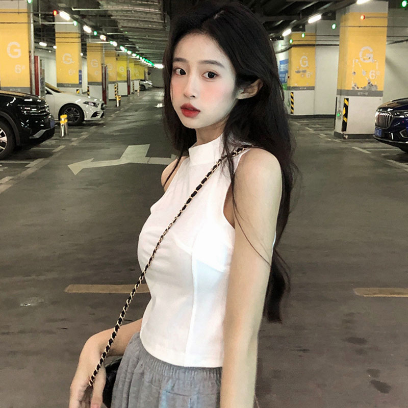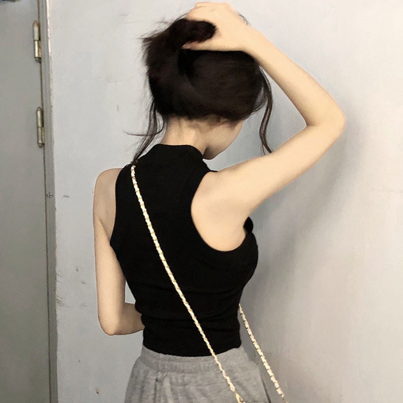 设计感时髦小立领无袖拼接打底衫背心外穿辣妹修身性感短款T恤女