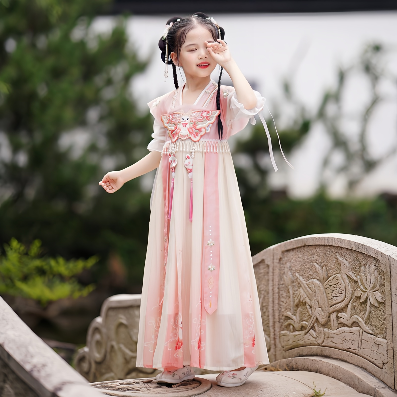 女童粉色汉服花神仙气飘飘夏款唐装连衣襦裙2024新款中国风公主裙