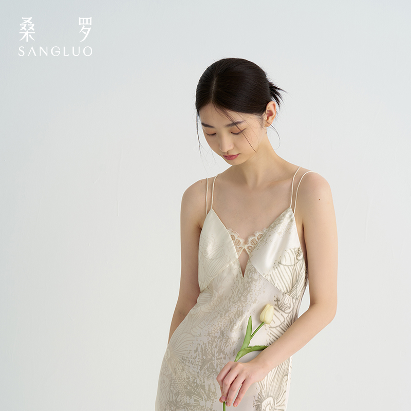 波纹蕾丝』桑罗真丝吊带裙优雅性感镂空100%桑蚕丝家居服度假睡裙