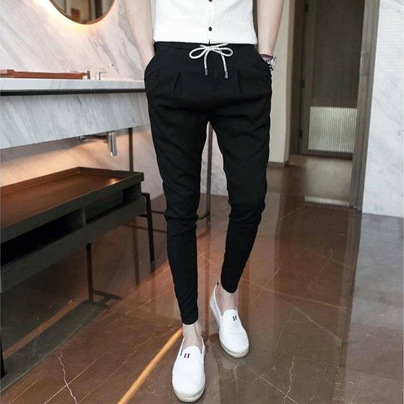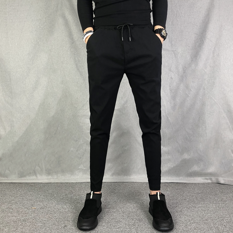 社会精神小伙裤子男修身九分小脚裤黑色束脚裤潮流修身休闲裤百搭