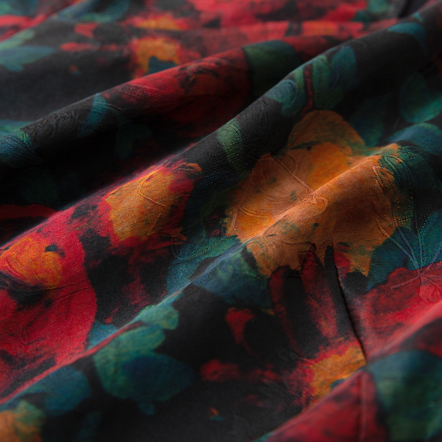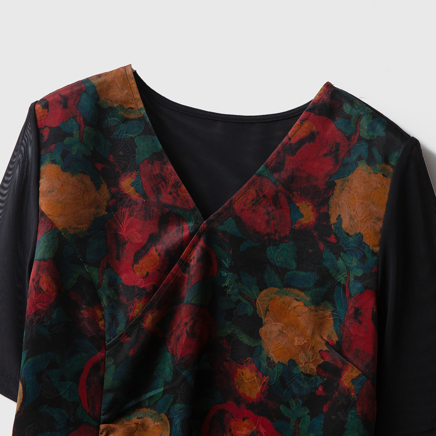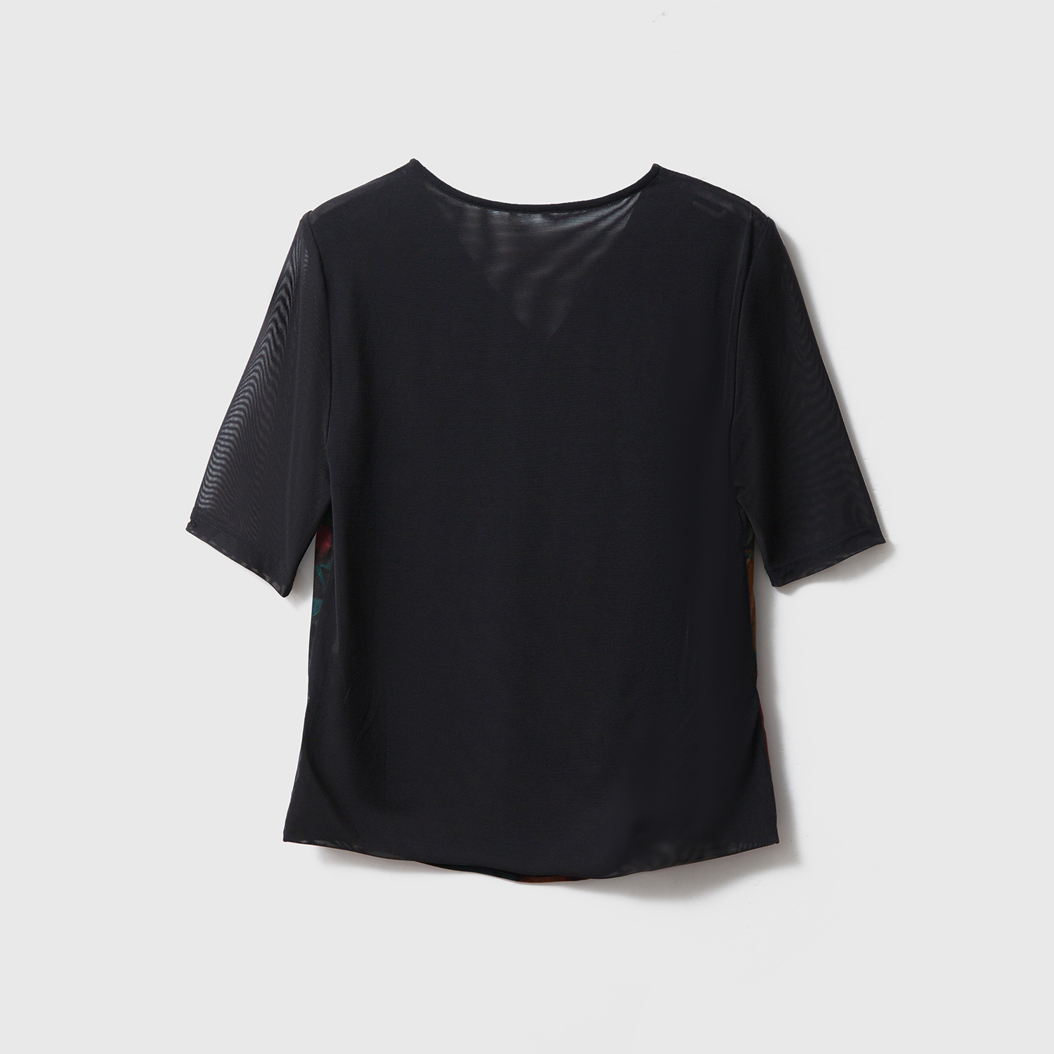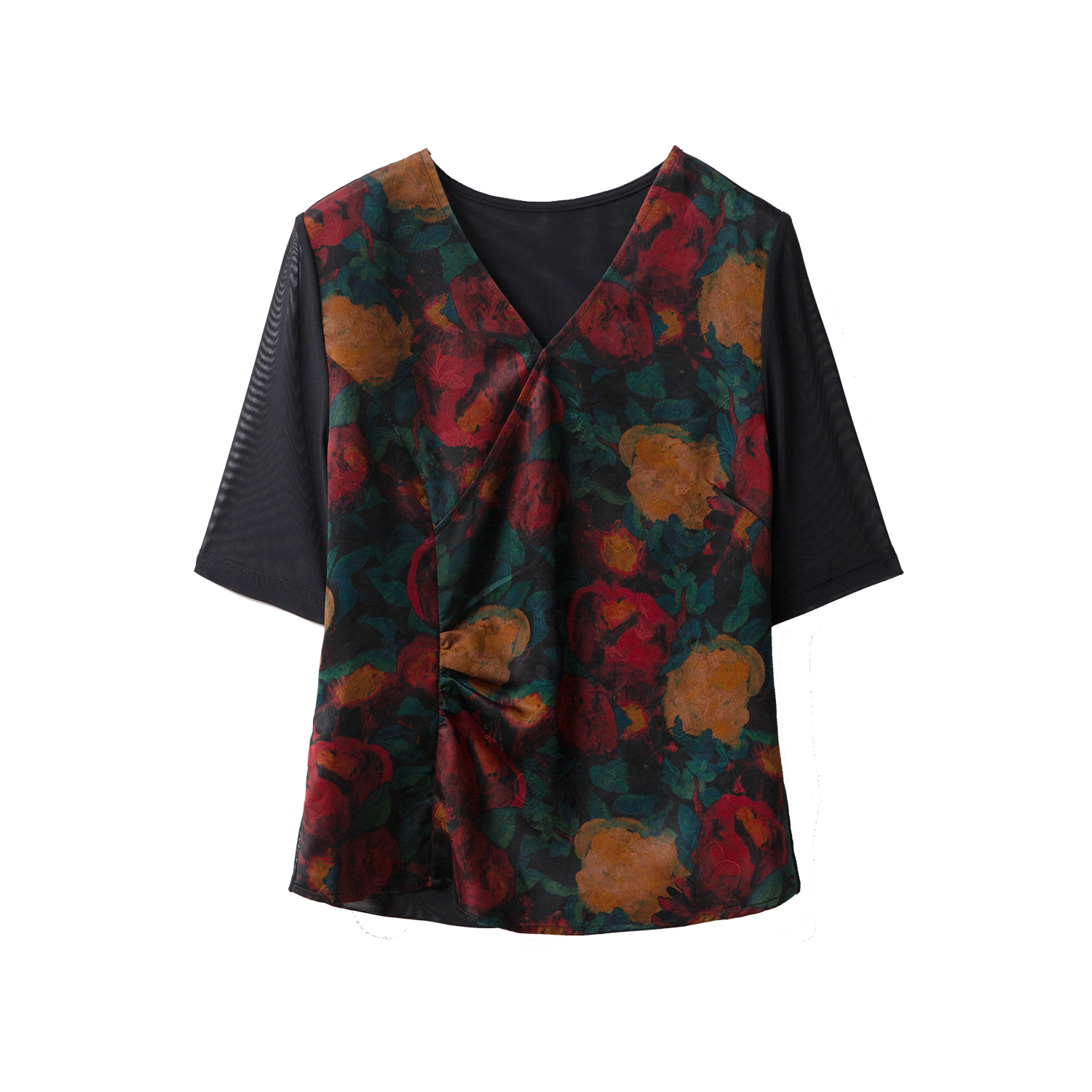 一丝牵 香云纱真丝素绉缎中袖上衣100%桑蚕丝拼接纱V领新中式小衫