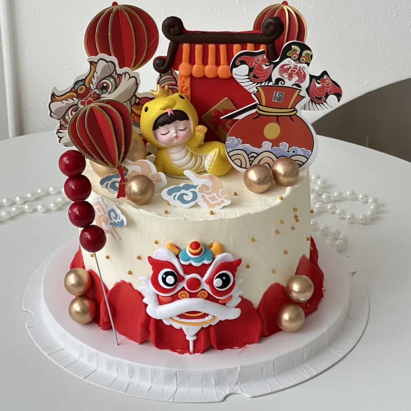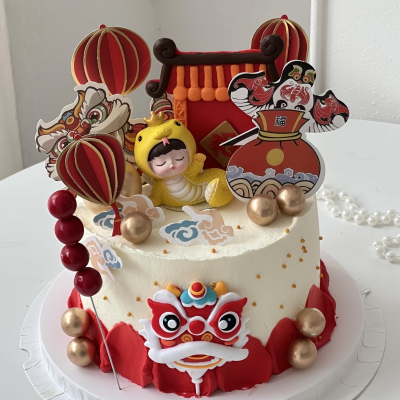 舞狮可爱蛇宝宝蛋糕装饰摆件中式糖葫芦福门百天满月甜品台插件