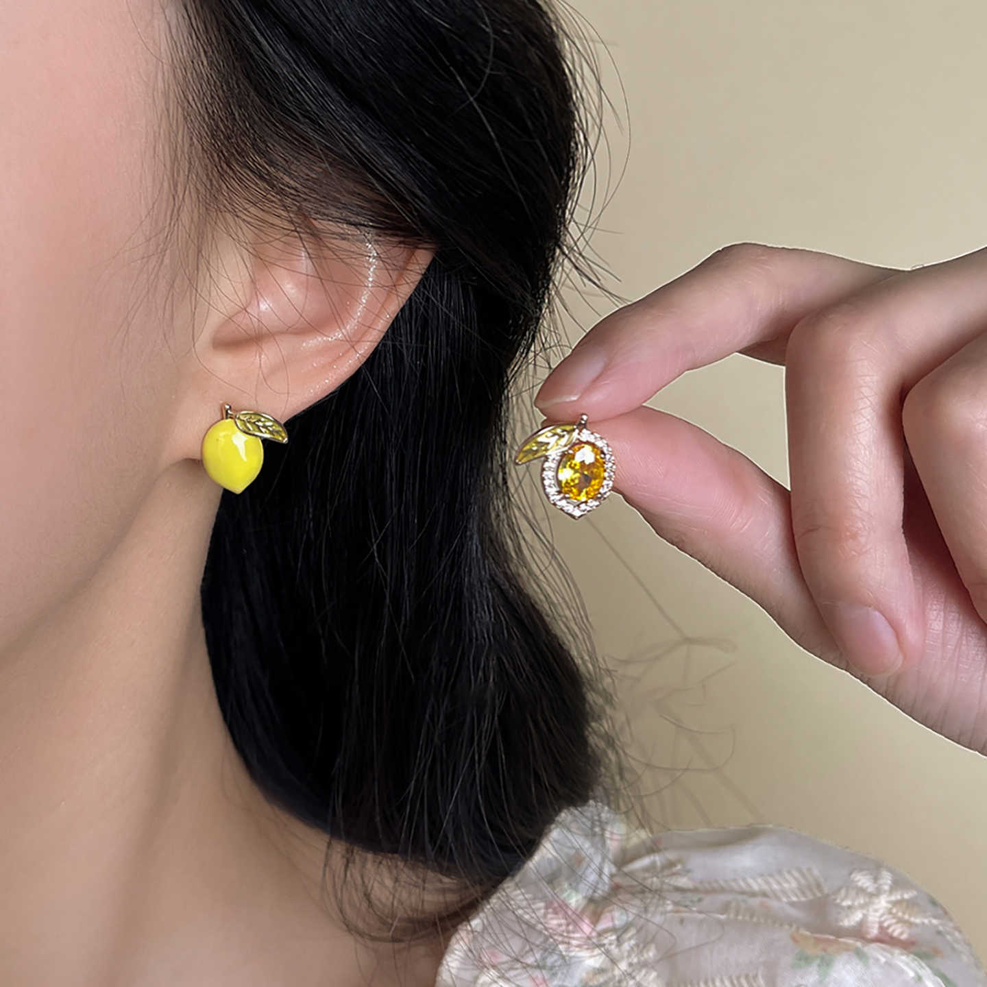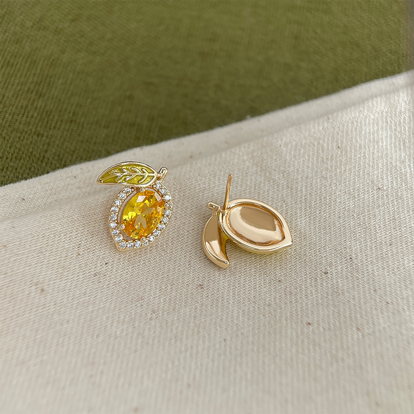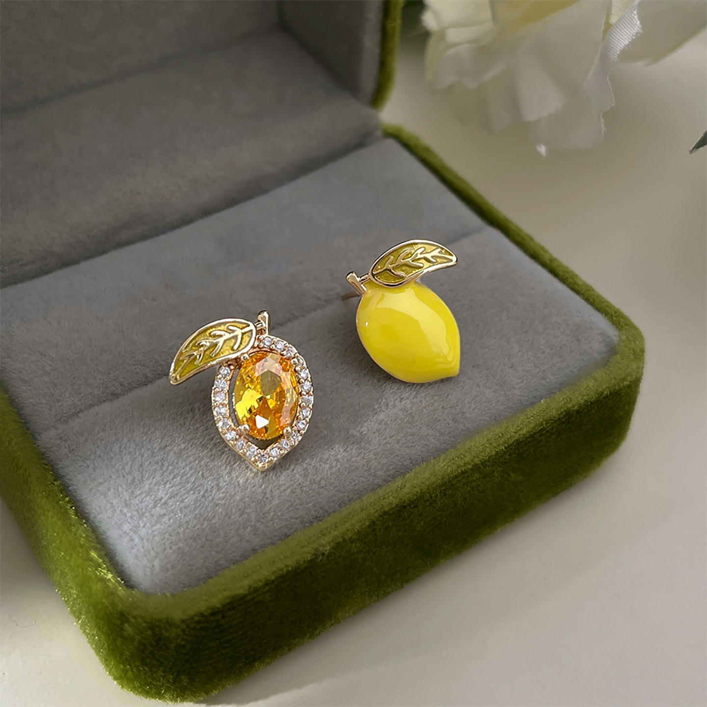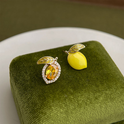 夏日柠檬黄耳钉可爱水果耳饰不对称小众设计师款925银针锆石耳环