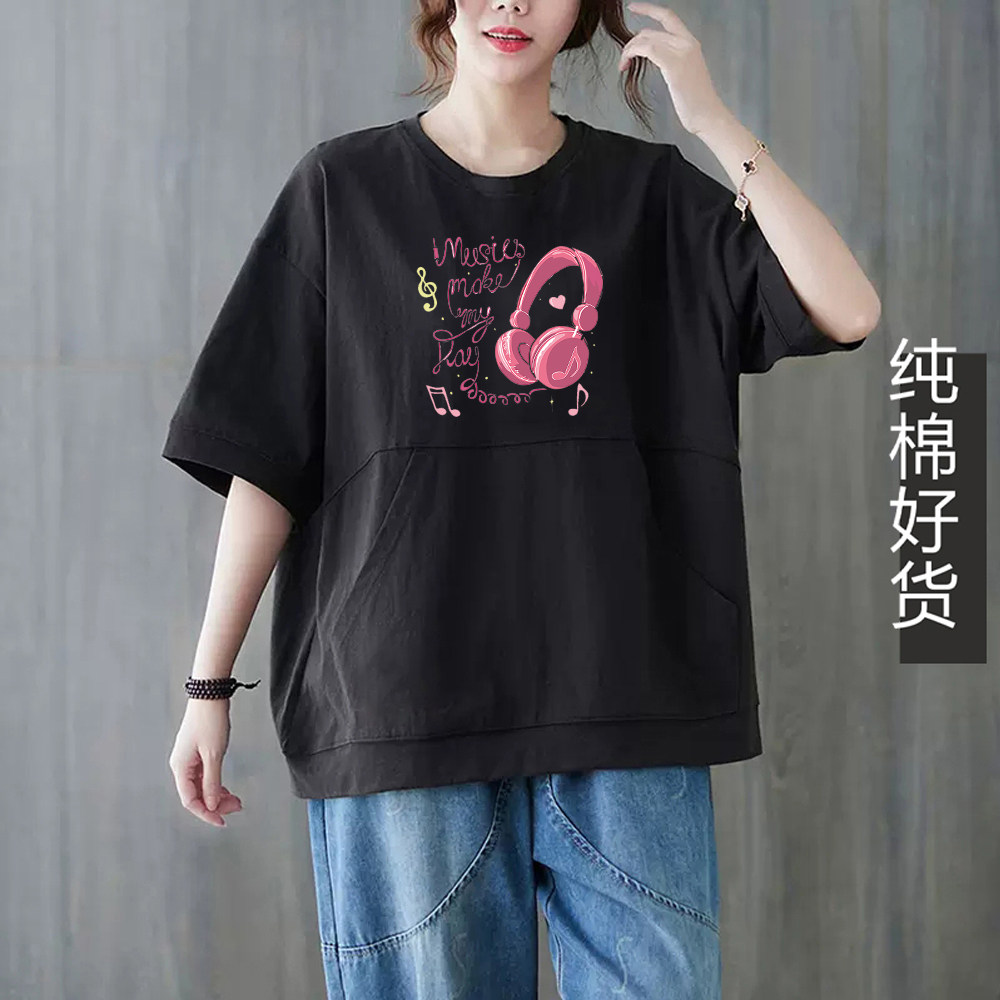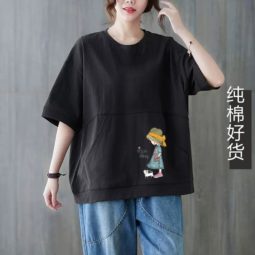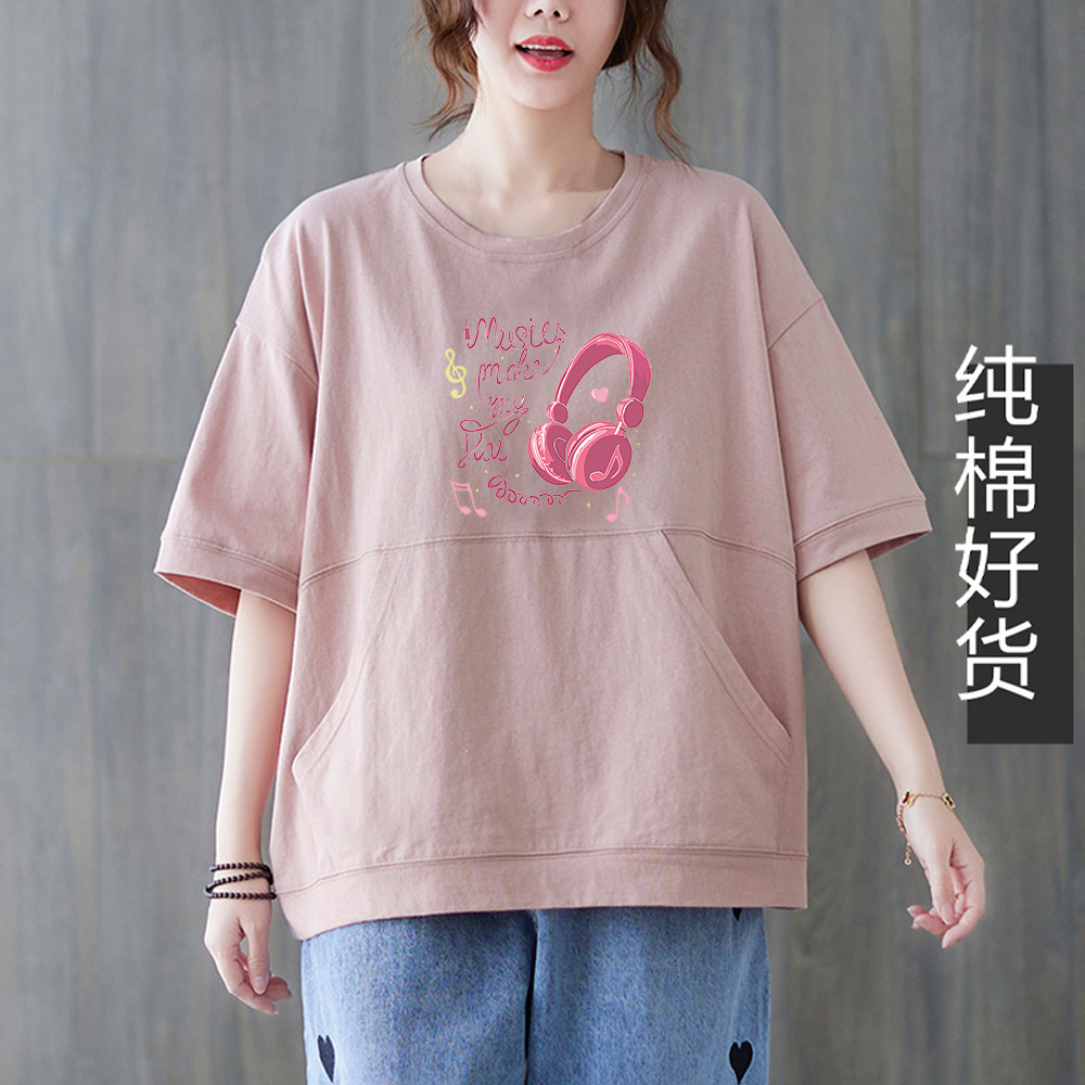 100%纯棉短袖t恤女2025夏季新款宽松显瘦减龄大码大口袋粉色上衣