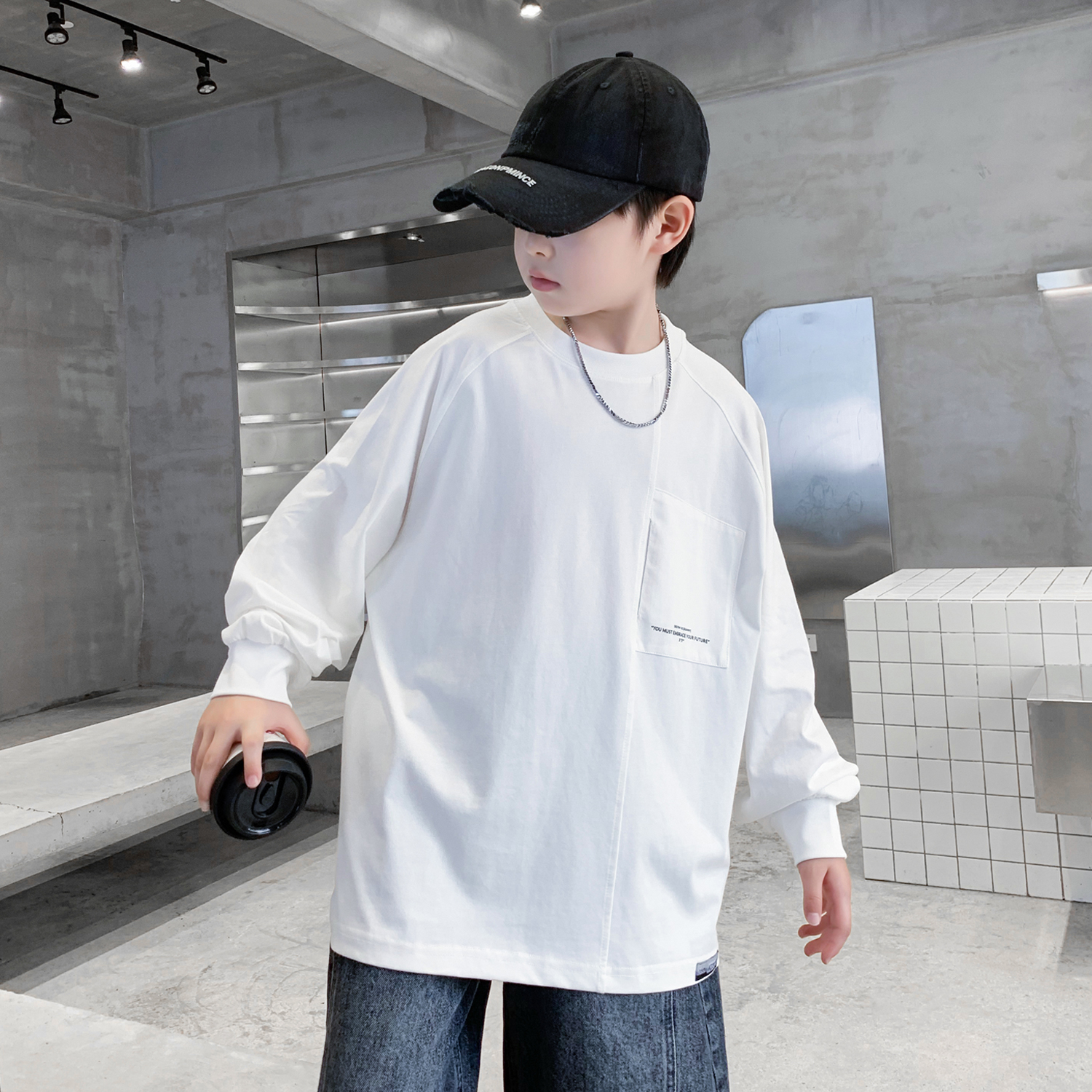 男童打底衫春秋新款纯色白色休闲