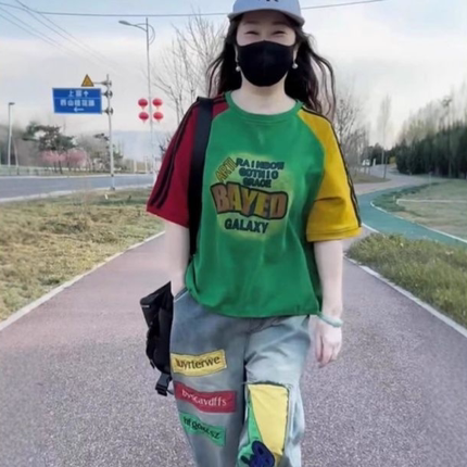 洋气时尚两件套装女2025年夏新款袖子拼色印花短袖水洗牛仔哈伦裤