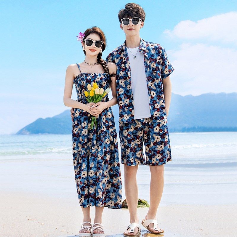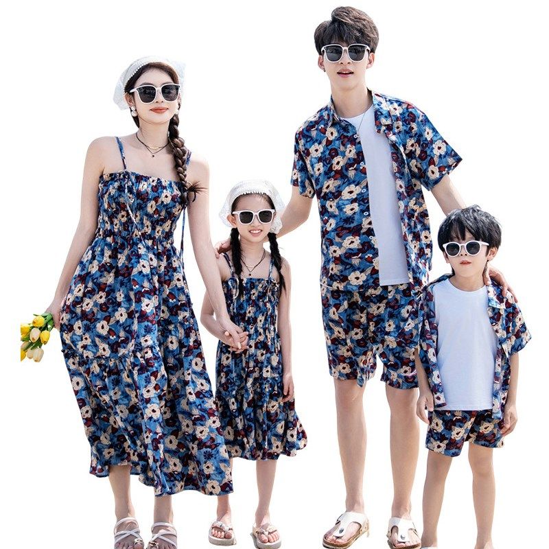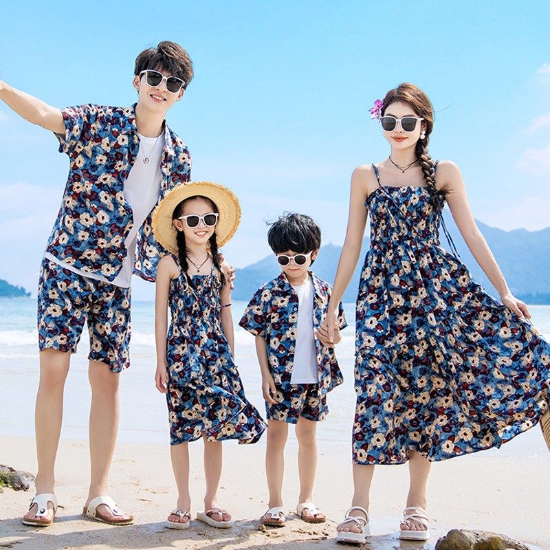 时尚印花吊带母女连衣裙母子父子父女情侣海边不一样的家庭亲子装